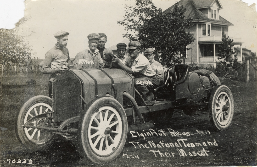 View of drivers Len Zengle, Don Herr, Johnny Aitken and others posing in National racecar with mascot, a pig named Sidney, during the 1911 Elgin National Stock Chassis races in Illinois. Printed on front: "Elgin Aut. Races, 1911. The National team and their mascot. Zengle, Herr, Atkin [sic]." Stamped on back: "Spooner & Wells, Inc., photographers, telephones 3472-3473 Columbus, 1931 Broadway, New York." Handwritten on back: "National, ca. 1911."