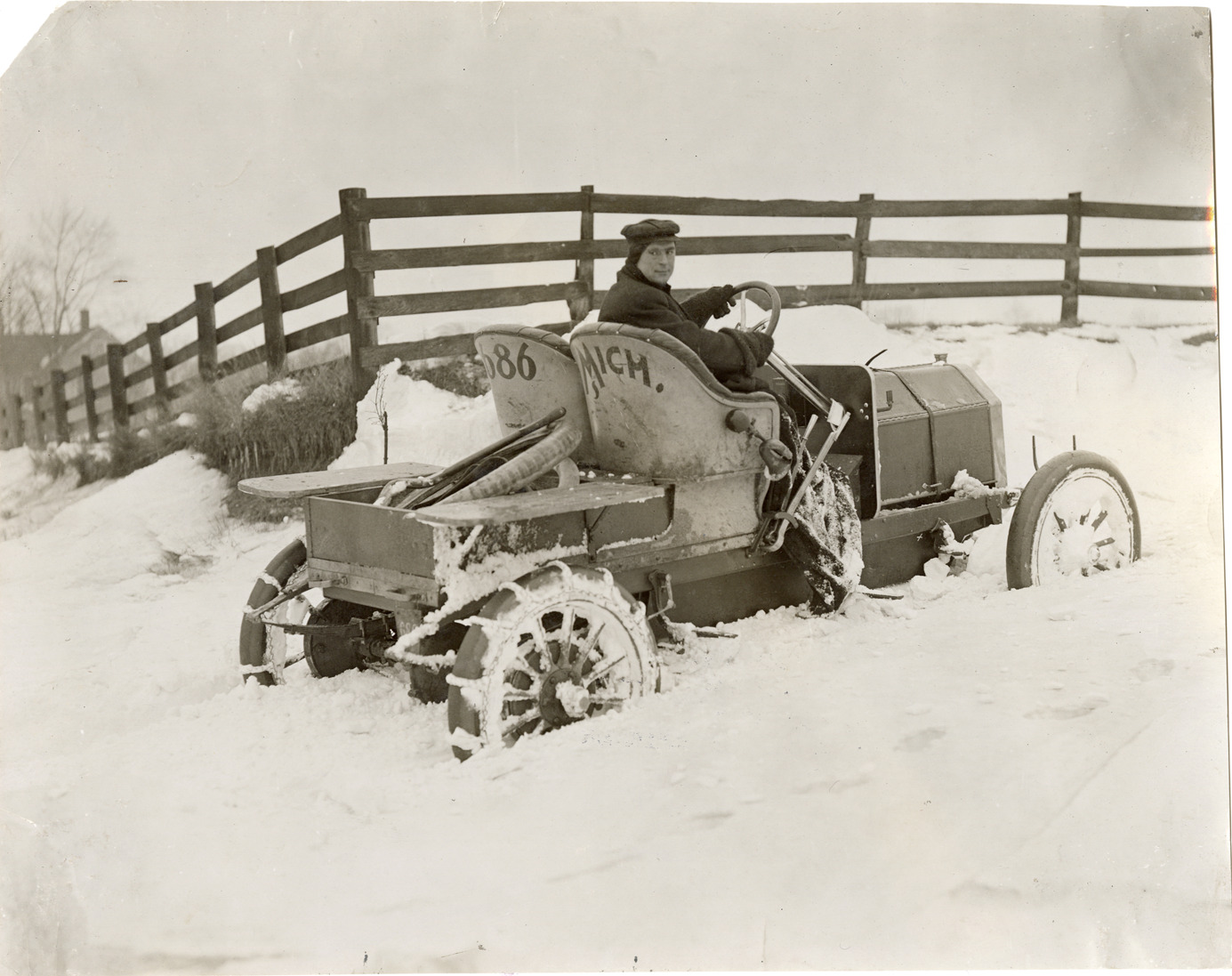 View of motorist driving a 1910 Oakland car in the snow. Stamped on back: "When this photograph is used for publication purposes in catalogues, pamphlets, etc. credit as follows will be appreciated: Photo by Spooner & Wells, Inc." Handwritten on back: "Oakland, 1910."