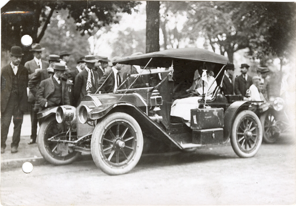 View of an Ohio car during the Wolverine Auto Club tour. Onlookers in background. Stamped on back: "Spooner & Wells, Inc., photographers, 1231 Woodward Ave., Detroit, Mich., telephone North 1745." Handwritten on back: "Wolverine tour at Ind. Race, 5/30/12. Ohio, ca. 1910-11."