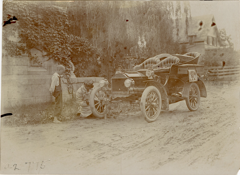 View of Dwight B. Huss changing tire of 1904 Oldsmobile car watched by boy wearing overalls during the 1904 St. Louis Tour. Banner with "St. Louis Tour, 53, A.A.A." displayed on side of car. The tour covered a route across five states from New York, New York to St. Louis, Missouri. Handwritten on back: "Olds, 1904. Dwight B. Huss."
