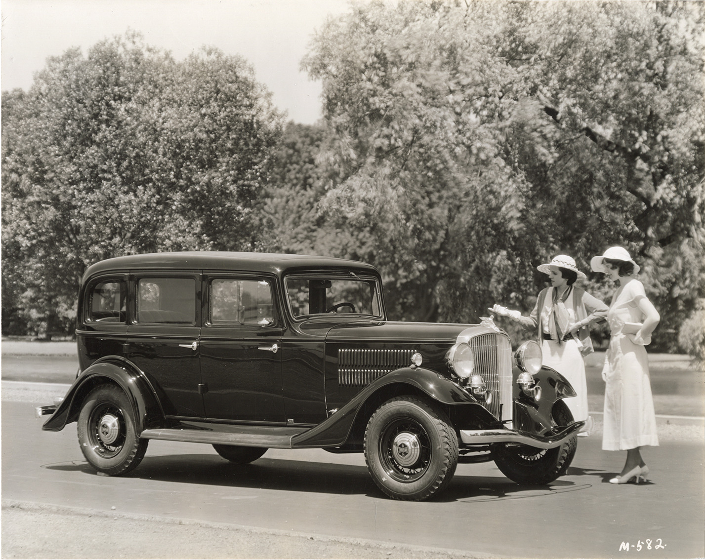 View of two women posing with a 1933 Essex Terraplane 6 Special Deluxe sedan. Handwritten on back: "July 14/33. 3/4 r. front. Essex Terraplane 6 Special Deluxe sedan with models. Hudson, 1933."