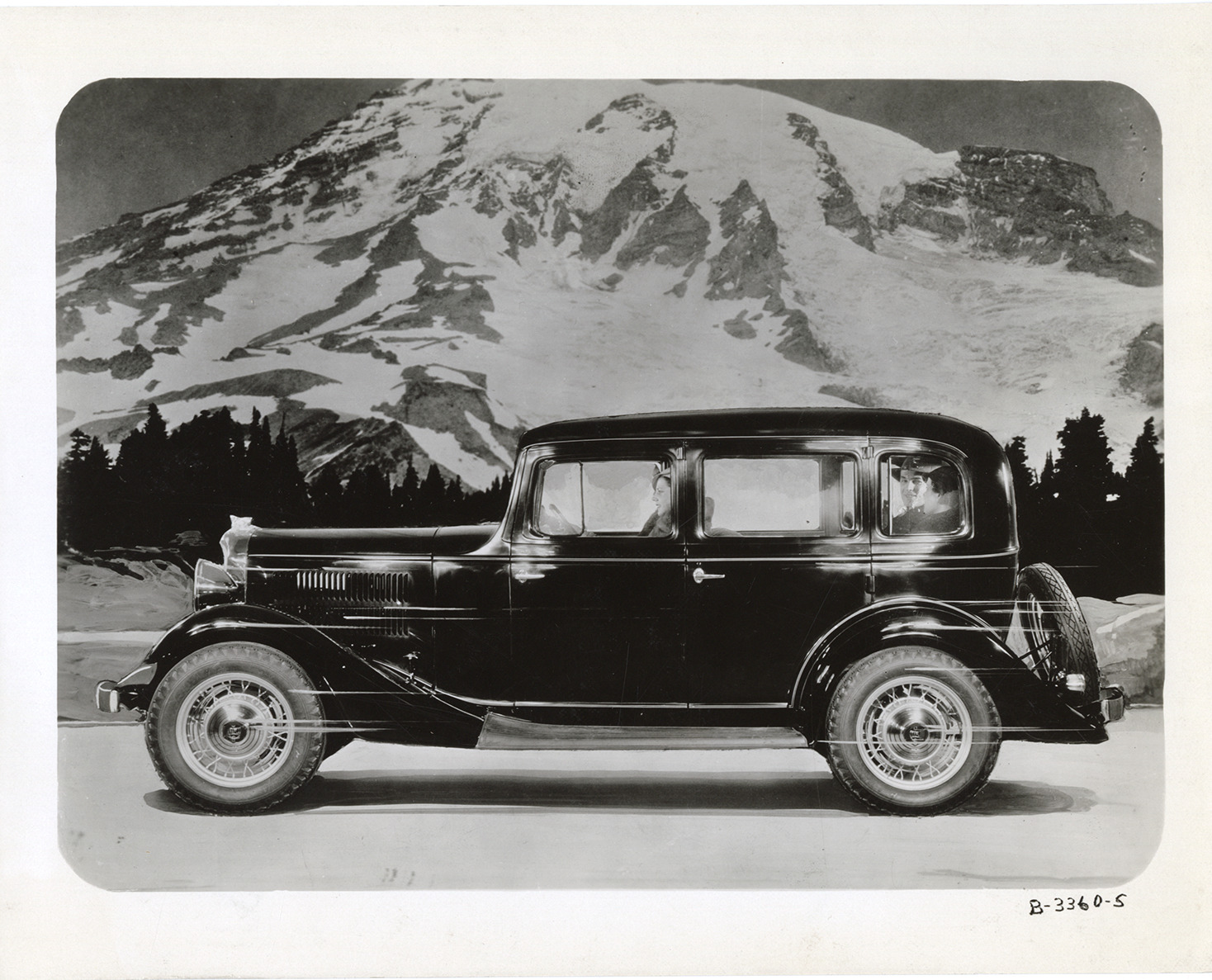 Artist's depiction of a woman driver posing in a 1933 Essex Terraplane 6 Series K Special sedan. Passengers in rear seat. Handwritten on back: "Jan. 25/33. Copy negative of retouched photo of Terraplane 6 with winter background. Used in ventilation folder."