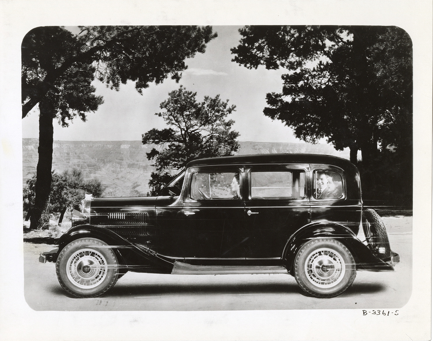 View of a woman driver posing in a 1933 Essex Terraplane 6 Series K Special sedan. Passengers in rear seat. Handwritten on back: "Jan. 25/33. Copy negative of retouched photo of Terraplane 6 with summer background. Used in ventilation folder."