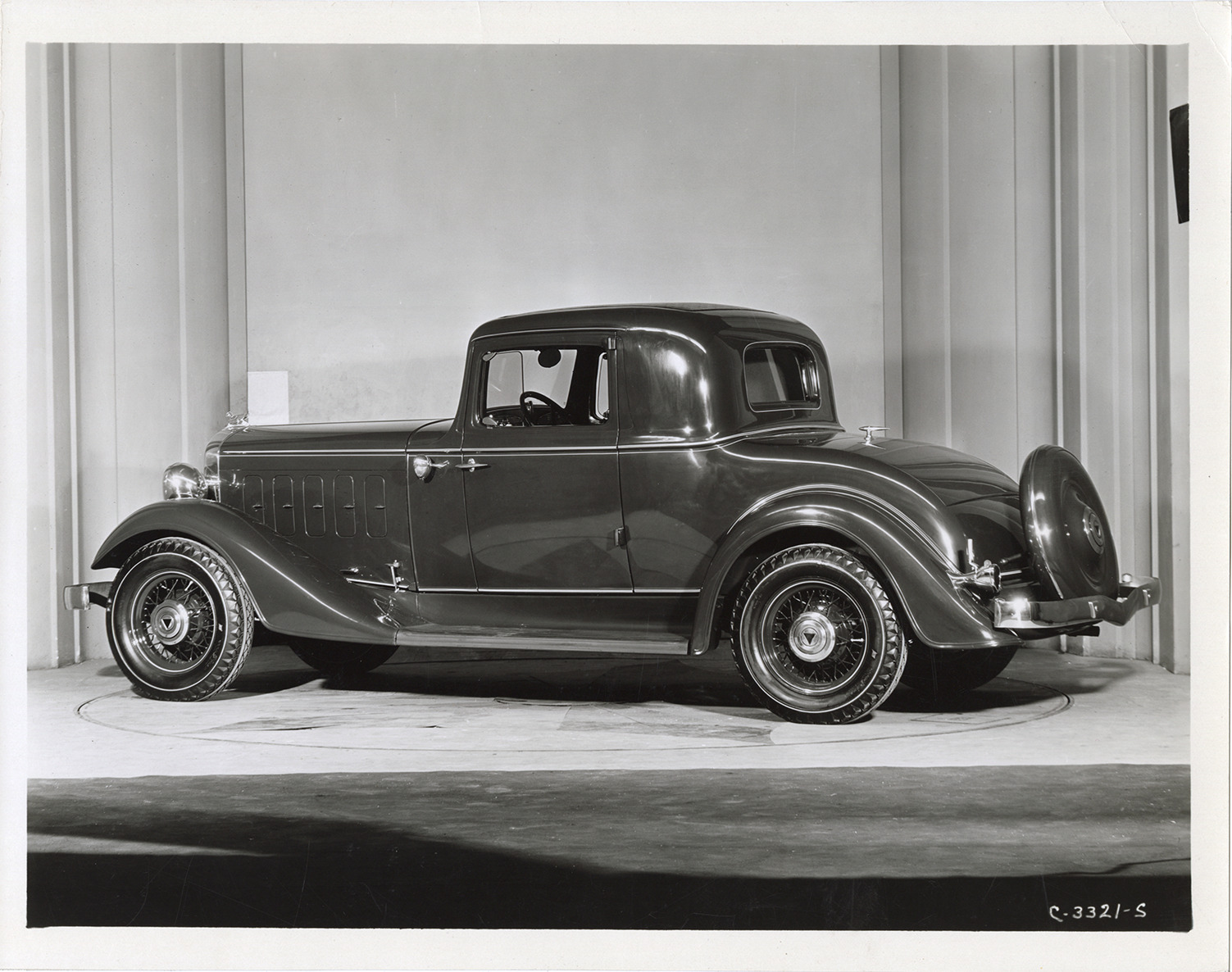 View of a 1933 Hudson 8 Series T coupe. Handwritten on back: "2-27-33. Model T, Hudson Stan. Series 8, 4 pass. coupe."