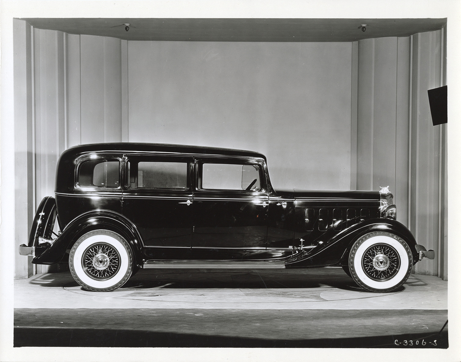View of a 1933 Hudson 8 Series L touring sedan. Handwritten on back: "Feb. 27, 1933. Model L, Hudson Major Series 8 touring sedan."