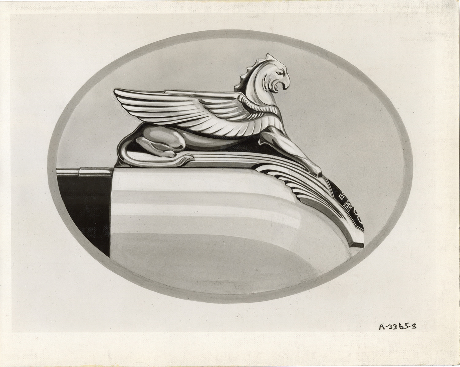 Artist's depiction of a gryphon radiator ornament for 1933 Hudson cars. Handwritten on back: "Dec. 2/32. The Griffon. Radiator ornament on all 1933 models."