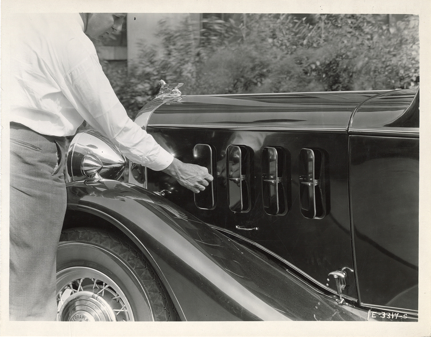 Favorite this☆ Ventilating louver doors, 1933 Essex Terraplane automobile Description: Close-up view of a man operating ventilating louver doors on 1933 Essex Terraplane 8 sedan. Handwritten on back: "June 9/33. Showing close up of ventilating louvre [sic] doors on SX [sic] Terraplane 8 sedan." Details Resource ID: na046639 Subject: Automobiles Hudson Motor Car Company Automobiles--Heating and ventilation Photographic prints Date Issued: 1933-06-09 Format: 1 photographic print mounted on fabric ; 8 x 10 in. Member of: National Automotive History Collection Filing Location: Hudson, 1933 #10 Rights: Physical rights are retained by DPL. Copyright is retained in accordance with U.S. copyright laws.