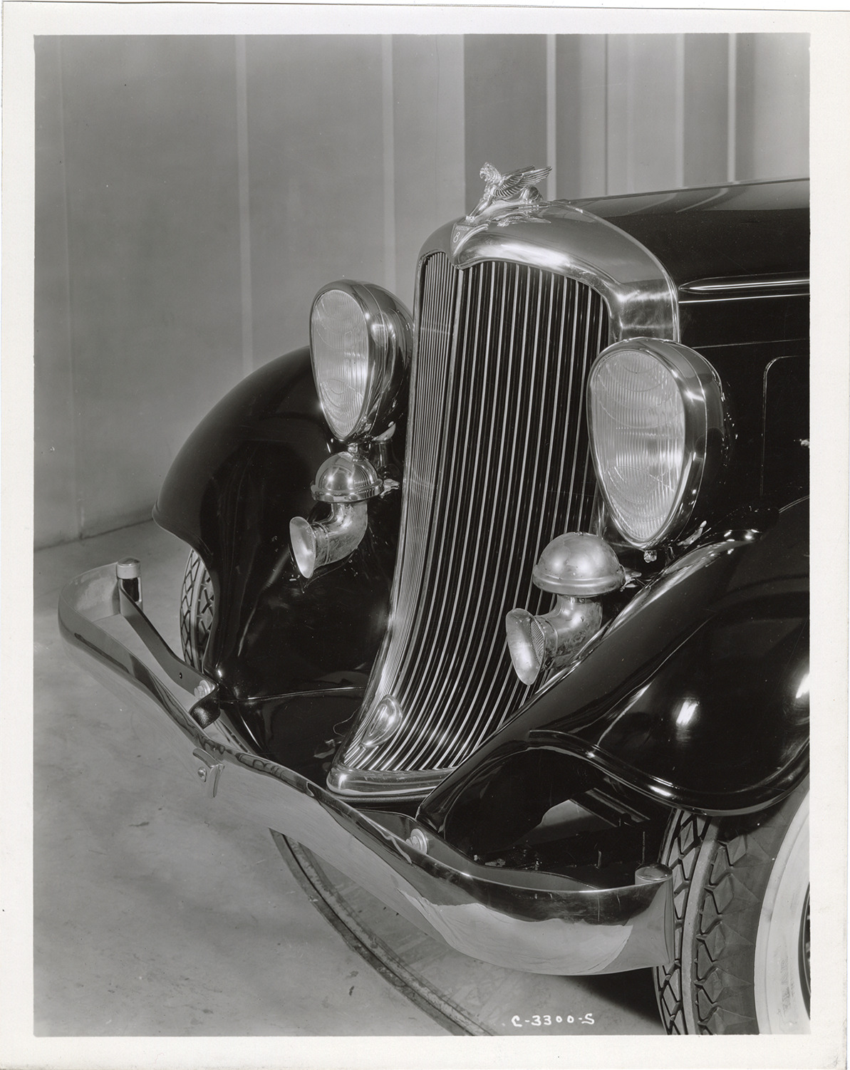 Close-up view of the front end of a 1933 Essex Terraplane 8 Series L touring sedan showing gryphon radiator ornament, headlamps and grille. Handwritten on back: "Feb. 27, 1933. Model L, Hudson Major Series 8 touring sedan."