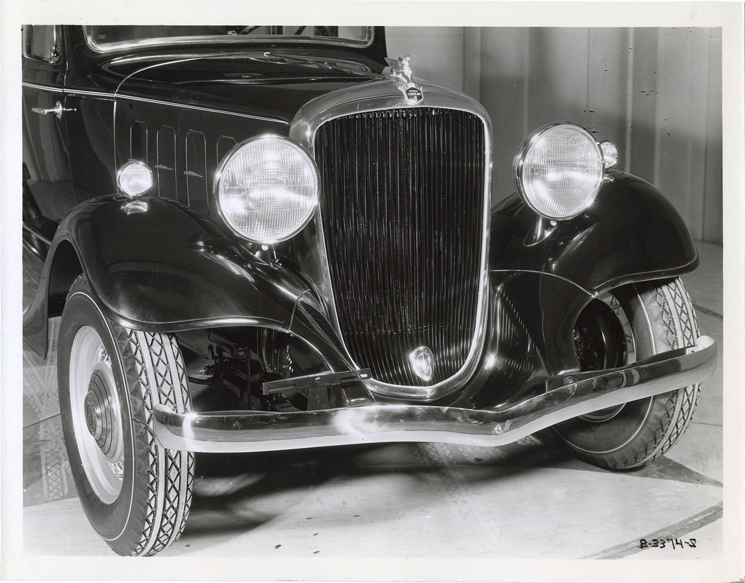 Favorite this☆ Front end, 1933 Essex Terraplane automobile Description: Close-up view of the front end of a 1933 Essex Terraplane 8 Series KT sedan showing gryphon radiator ornament, headlamps and grille. Handwritten on back: "Feb. 27, 1933. Model KT, Terraplane 8 sedan." Details Resource ID: na046658 Subject: Automobiles--Radiator ornaments Griffins Automobiles--Grilles Automobiles--Lighting Hudson Motor Car Company Photographic prints Date Issued: 1933-02-27 Format: 1 photographic print mounted on fabric ; 8 x 10 in. Member of: National Automotive History Collection Filing Location: Hudson, 1933 #11 Rights: Physical rights are retained by DPL. Copyright is retained in accordance with U.S. copyright laws.