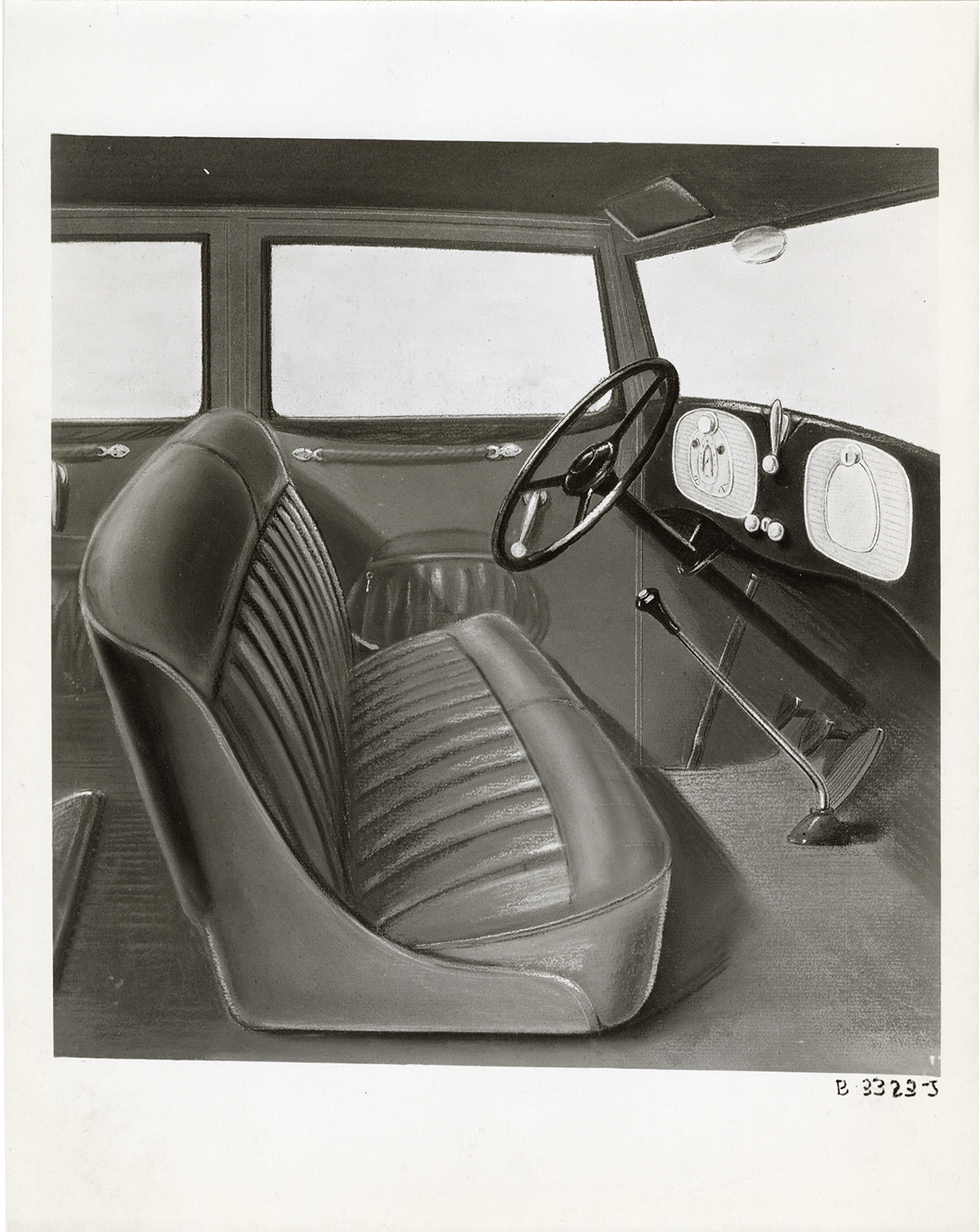 Artist's depiction of the front seat and steering wheel in a 1933 Hudson 8 Standard Series T sedan. Handwritten on back: "Dec. 20/32. T. Hudson Standard Series '8' front interior. Copy of pastel colored drawing."