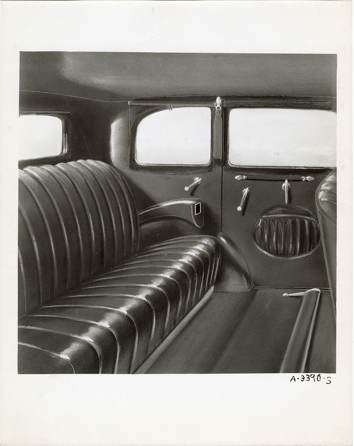Favorite this☆ Interior, 1933 Hudson automobile Description: Artist's depiction of the rear seat in a 1933 Hudson 8 Standard Series T sedan. Handwritten on back: "Dec. 8/32. T, 119" wb. Hudson Eight Standard Series, rear interior. Copy of pastel color drawing." Details Resource ID: na046702 Subject: Automobiles--Seats Automobiles--Interiors Hudson automobile Photographic prints Date Issued: 1932-12-08 Format: 1 photographic print mounted on fabric ; 10 x 8 in. Member of: National Automotive History Collection Filing Location: Hudson, 1933 #12 Rights: Physical rights are retained by DPL. Copyright is retained in accordance with U.S. copyright laws.