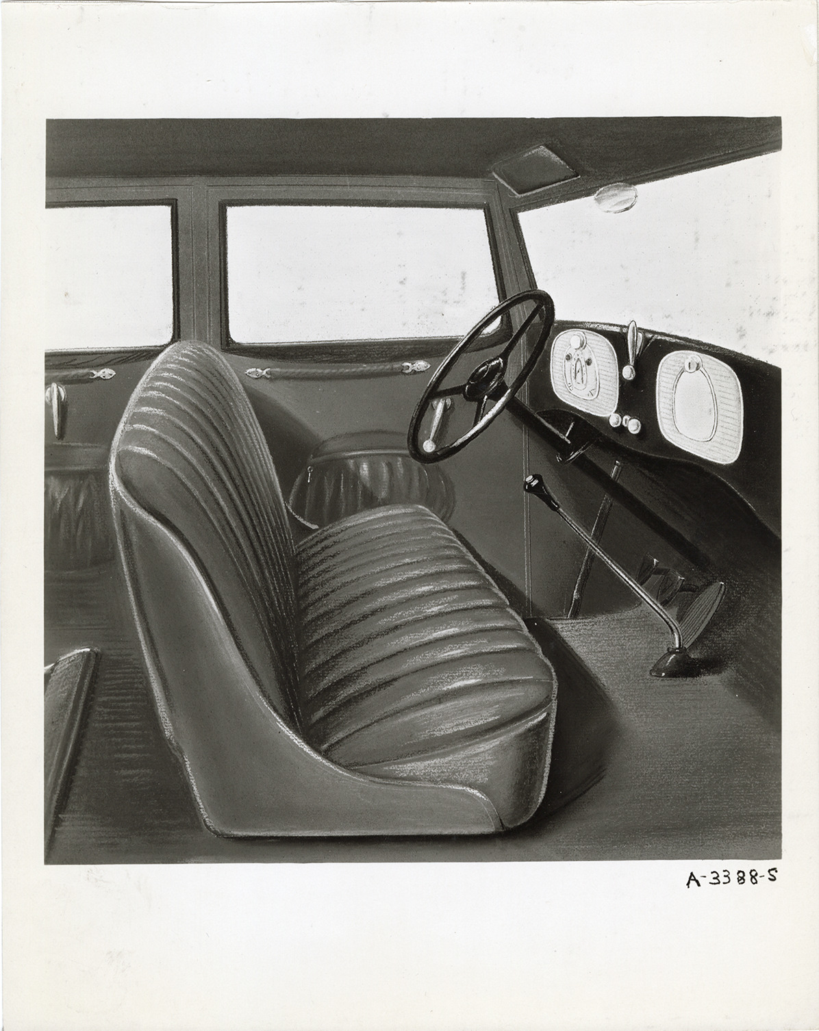 Favorite this☆ Interior, 1933 Hudson automobile Description: Artist's depiction of the front seat and steering wheel in a 1933 Hudson 8 Standard Series T sedan. Handwritten on back: "Dec. 8/32. T, 119" wb. Hudson Eight Standard Series, front interior. Copy of pastel color drawing." Details Resource ID: na046703 Subject: Automobiles--Seats Automobiles--Interiors Hudson automobile Photographic prints Date Issued: 1932-12-08 Format: 1 photographic print mounted on fabric ; 10 x 8 in. Member of: National Automotive History Collection Filing Location: Hudson, 1933 #13 Rights: Physical rights are retained by DPL. Copyright is retained in accordance with U.S. copyright laws.
