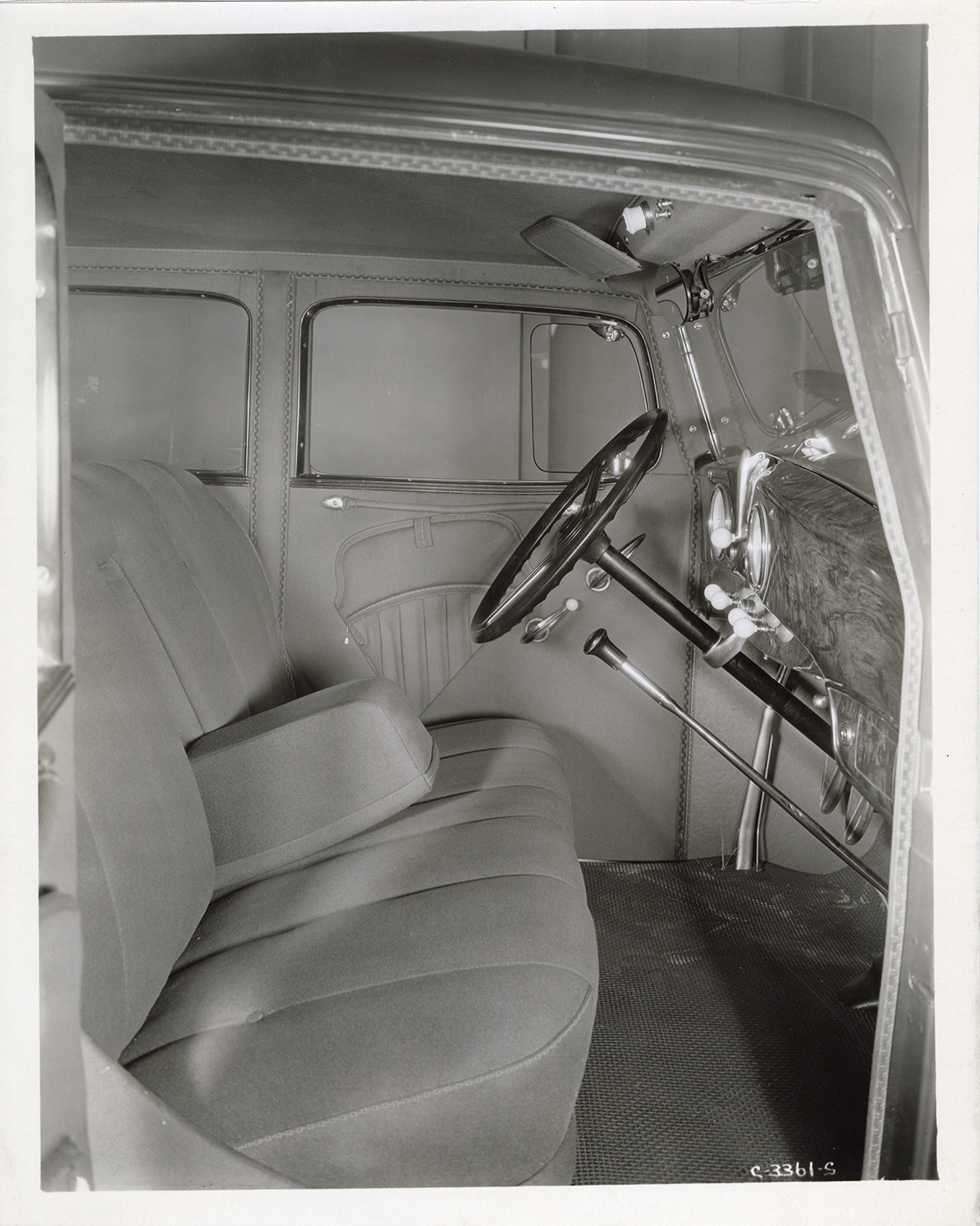 Favorite this☆ Interior, 1933 Hudson automobile Description: View of the front seat and steering wheel in a 1933 Hudson 8 Major Series L club sedan. Handwritten on back: "2-28-33. Model L, Hudson 8 Major Series club sedan, front int." Details Resource ID: na046704 Subject: Automobiles--Seats Automobiles--Interiors Hudson automobile Photographic prints Date Issued: 1933-02-28 Format: 1 photographic print mounted on fabric ; 10 x 8 in. Member of: National Automotive History Collection Filing Location: Hudson, 1933 #13 Rights: Physical rights are retained by DPL. Copyright is retained in accordance with U.S. copyright laws.