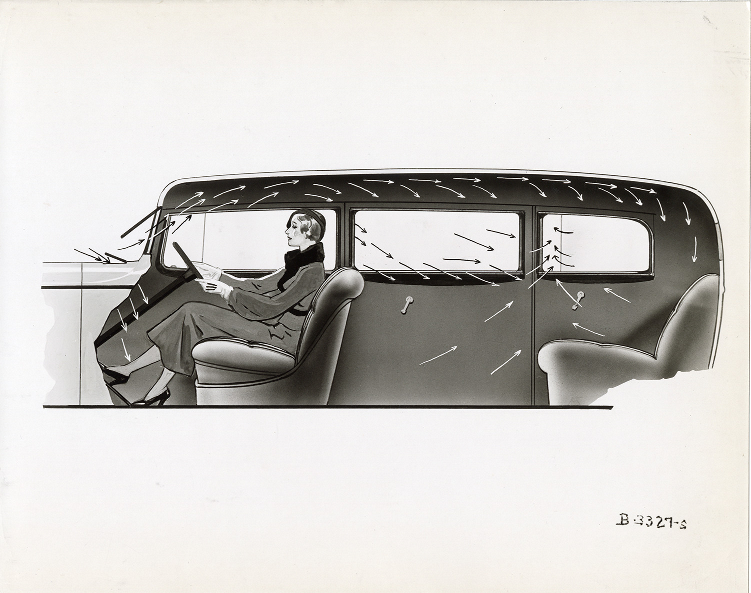 Favorite this☆ Illustration showing air currents, 1933 Hudson automobile Description: Illustration of air currents throughout a 1933 Hudson car. Woman driver in front seat. Handwritten on back: "Dec. 20/32. Copy negative of drawing showing air currents." Details Resource ID: na046712 Subject: Automobiles Air flow Automobiles--Heating and ventilation Hudson automobile Women automobile drivers Photographic prints Date Issued: 1932-12-20 Format: 1 photographic print mounted on fabric ; 8 x 10 in. Member of: National Automotive History Collection Filing Location: Hudson, 1933 #13 Rights: Physical rights are retained by DPL. Copyright is retained in accordance with U.S. copyright laws.