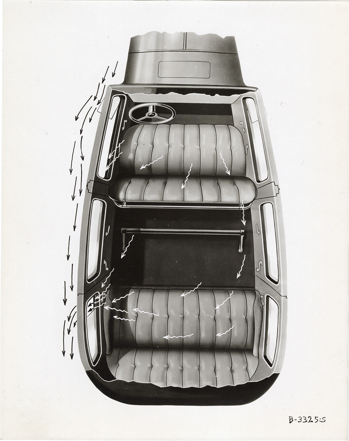 Favorite this☆ Illustration showing air currents, 1933 Hudson automobile Description: Illustration of air currents through windows and interior of a 1933 Hudson car, overhead view. Handwritten on back: "Dec. 20/32. Copy negative of drawing showing air currents." Details Resource ID: na046715 Subject: Automobiles--Windows and windshields Air flow Automobiles--Heating and ventilation Automobiles--Seats Hudson automobile Photographic prints Date Issued: 1932-12-20 Format: 1 photographic print mounted on fabric ; 10 x 8 in. Member of: National Automotive History Collection Filing Location: Hudson, 1933 #13 Rights: Physical rights are retained by DPL. Copyright is retained in accordance with U.S. copyright laws.