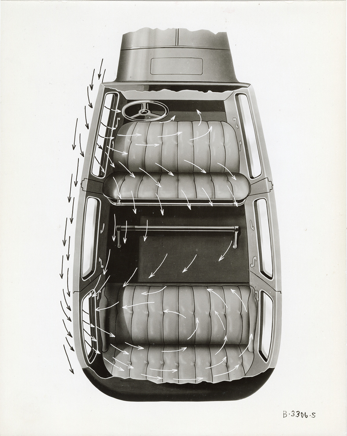 Illustration of air currents through windows and interior of a 1933 Hudson car, overhead view. Handwritten on back: "Dec. 17/32."