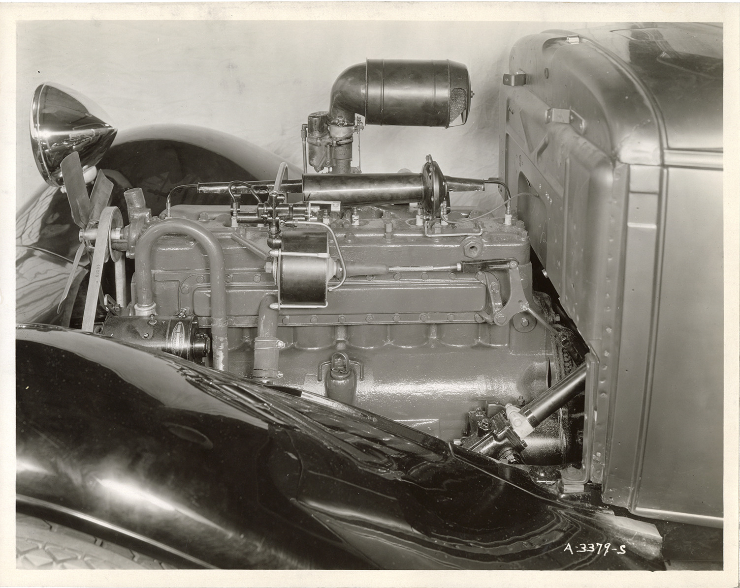 Close-up view of the engine for a 1933 Essex Terraplane 8 Series KT car. Handwritten on back: "Dec. 6/32. K.T. Essex Terraplane Eight motor with new air cleaner in chassis. Left side."