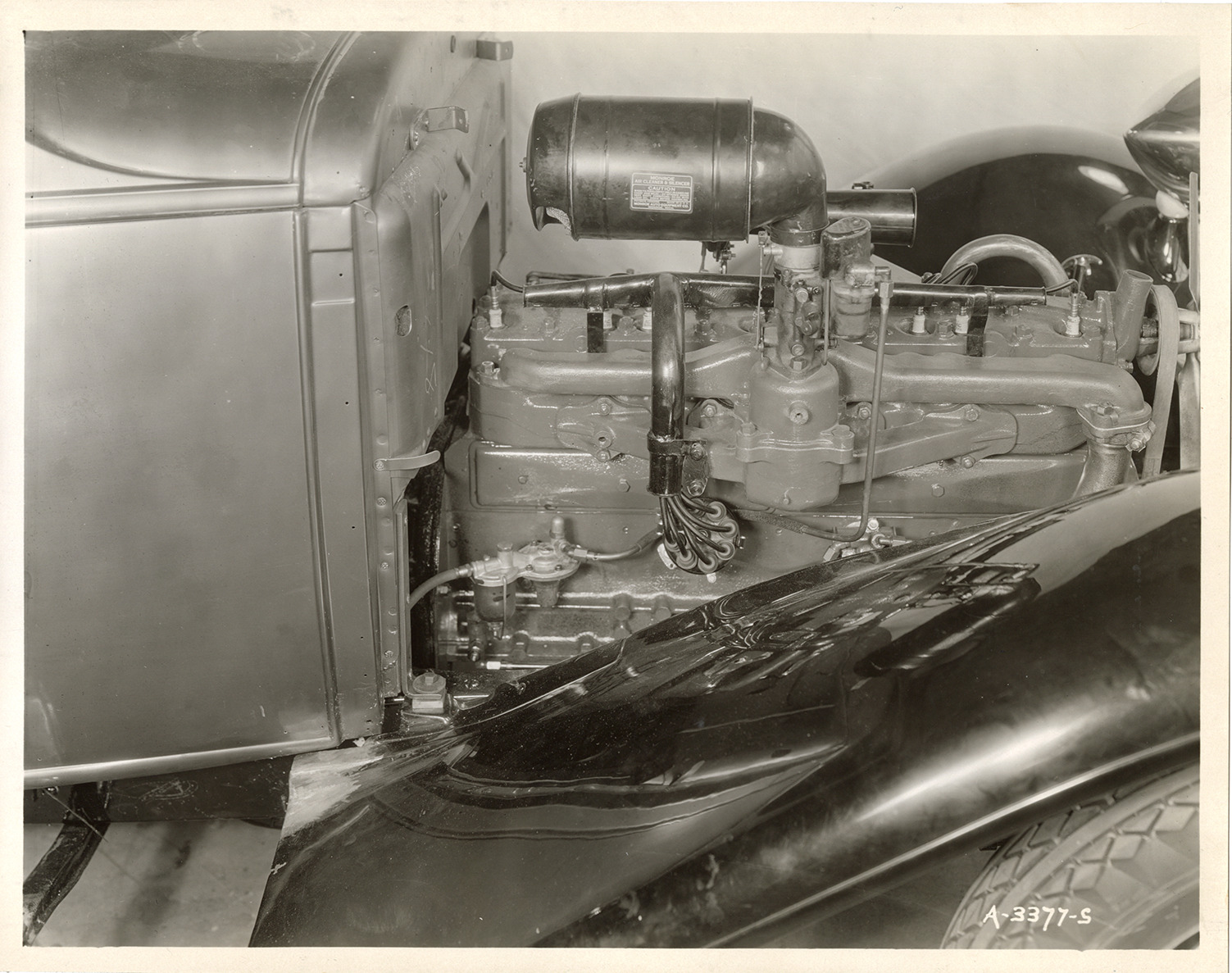 Close-up view of the engine for a 1933 Essex Terraplane 8 Series KT car. Handwritten on back: "Dec. 6/32. K.T. Essex Terraplane Eight motor with new air cleaner in chassis. Right side."