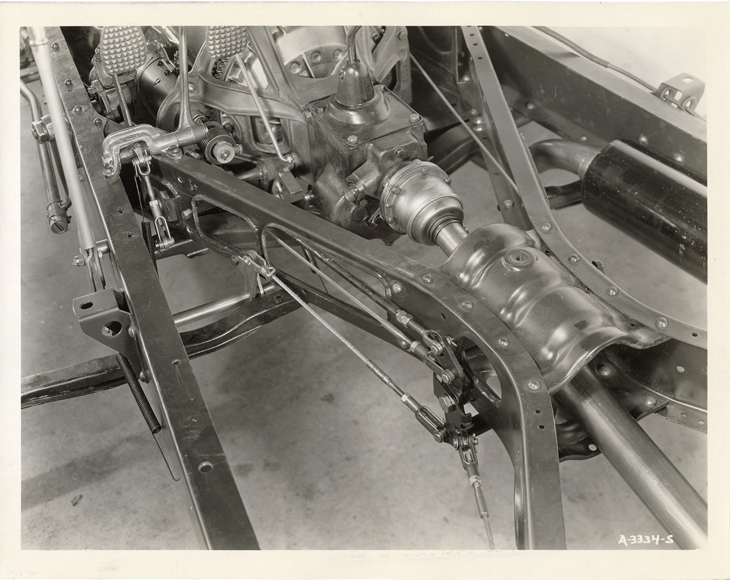 Close-up view of the chassis for a 1933 Hudson car. Handwritten on back: "Nov. 26/32."