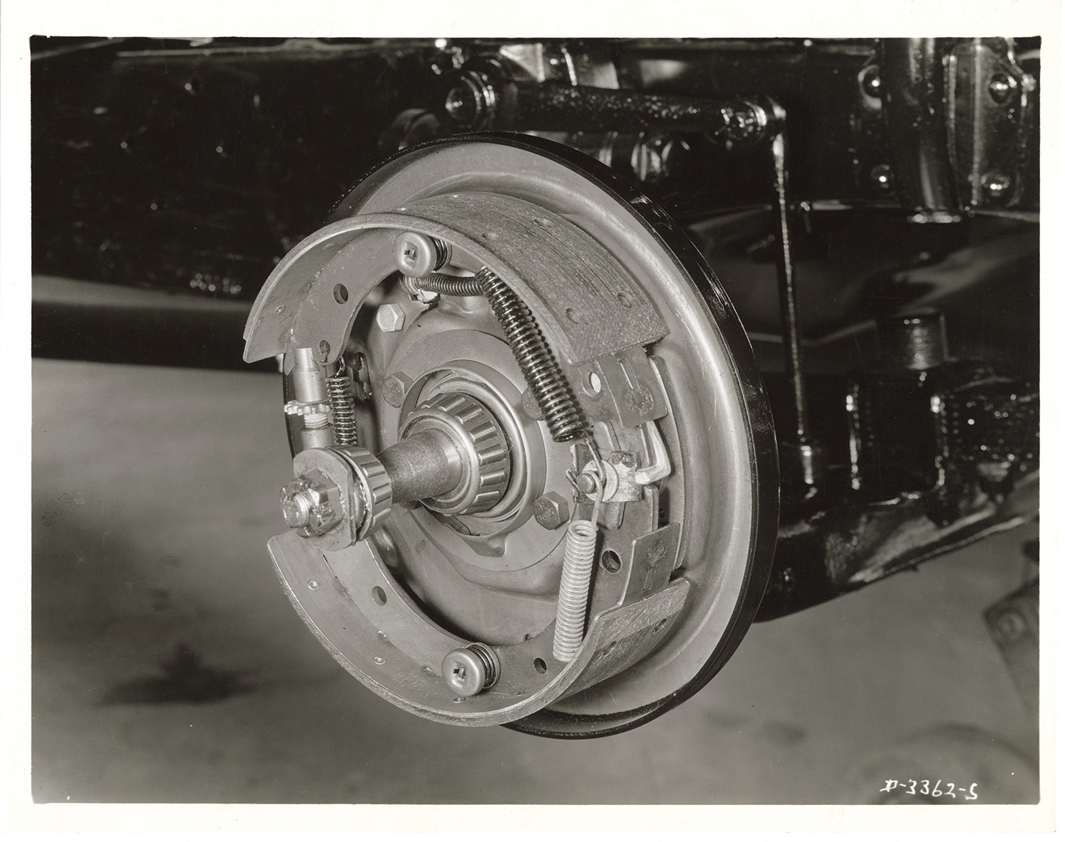 Favorite this☆ Brake, 1933 Essex Terraplane automobile Description: Close-up view of the brake assembly for a 1933 Essex Terraplane 8 Series KT car. Handwritten on back: "March 21/33. K.T. Showing brake assembly, Essex Terraplane Eight." Details Resource ID: na046788 Subject: Automobiles--Brakes Hudson Motor Car Company Photographic prints Date Issued: 1933-03-21 Format: 1 photographic print mounted on fabric ; 8 x 10 in. Member of: National Automotive History Collection Filing Location: Hudson, 1933 #16 Rights: Physical rights are retained by DPL. Copyright is retained in accordance with U.S. copyright laws.