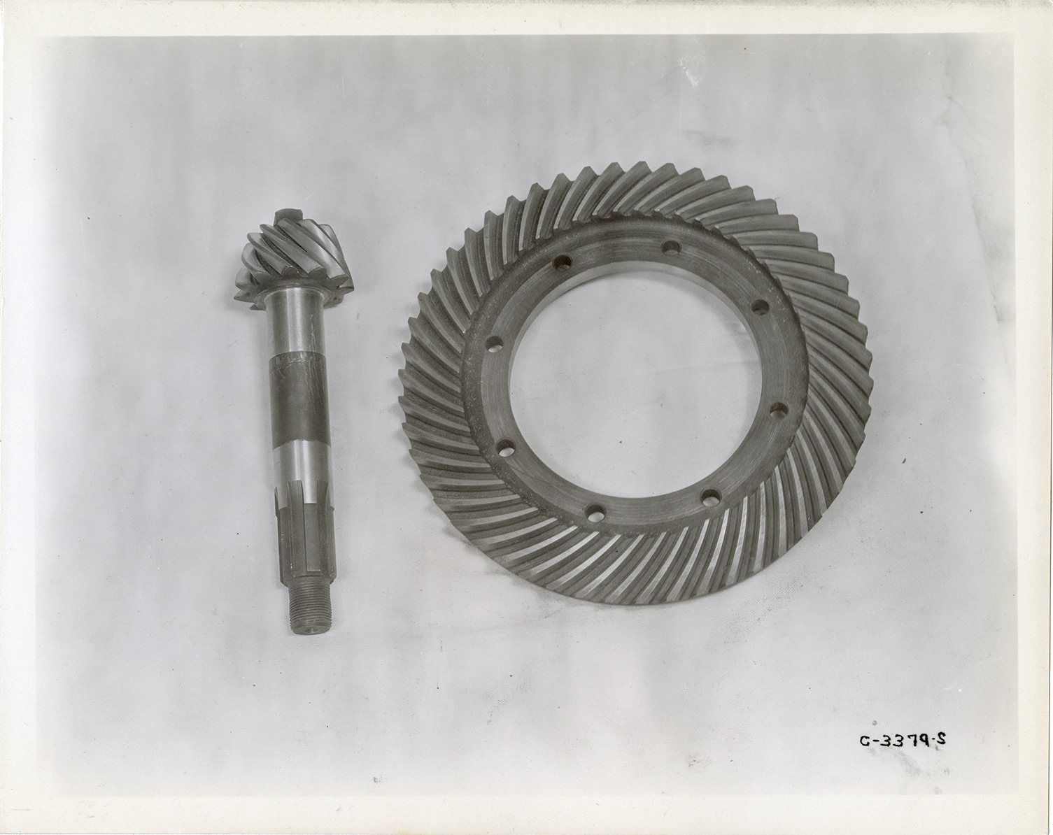 Favorite this☆ Pinion and ring gear, 1933 Hudson automobile Description: View of pinion and ring gear for 1933 Hudson 8 Series L and T cars. Handwritten on back: "2-28-33. Model L & T (Hudson 8). Pinion & ring gear." Details Resource ID: na046816 Subject: Gearing Hudson automobile Photographic prints Date Issued: 1933-02-28 Format: 1 photographic print mounted on fabric ; 8 x 10 in. Member of: National Automotive History Collection Filing Location: Hudson, 1933 #17 Rights: Physical rights are retained by DPL. Copyright is retained in accordance with U.S. copyright laws.