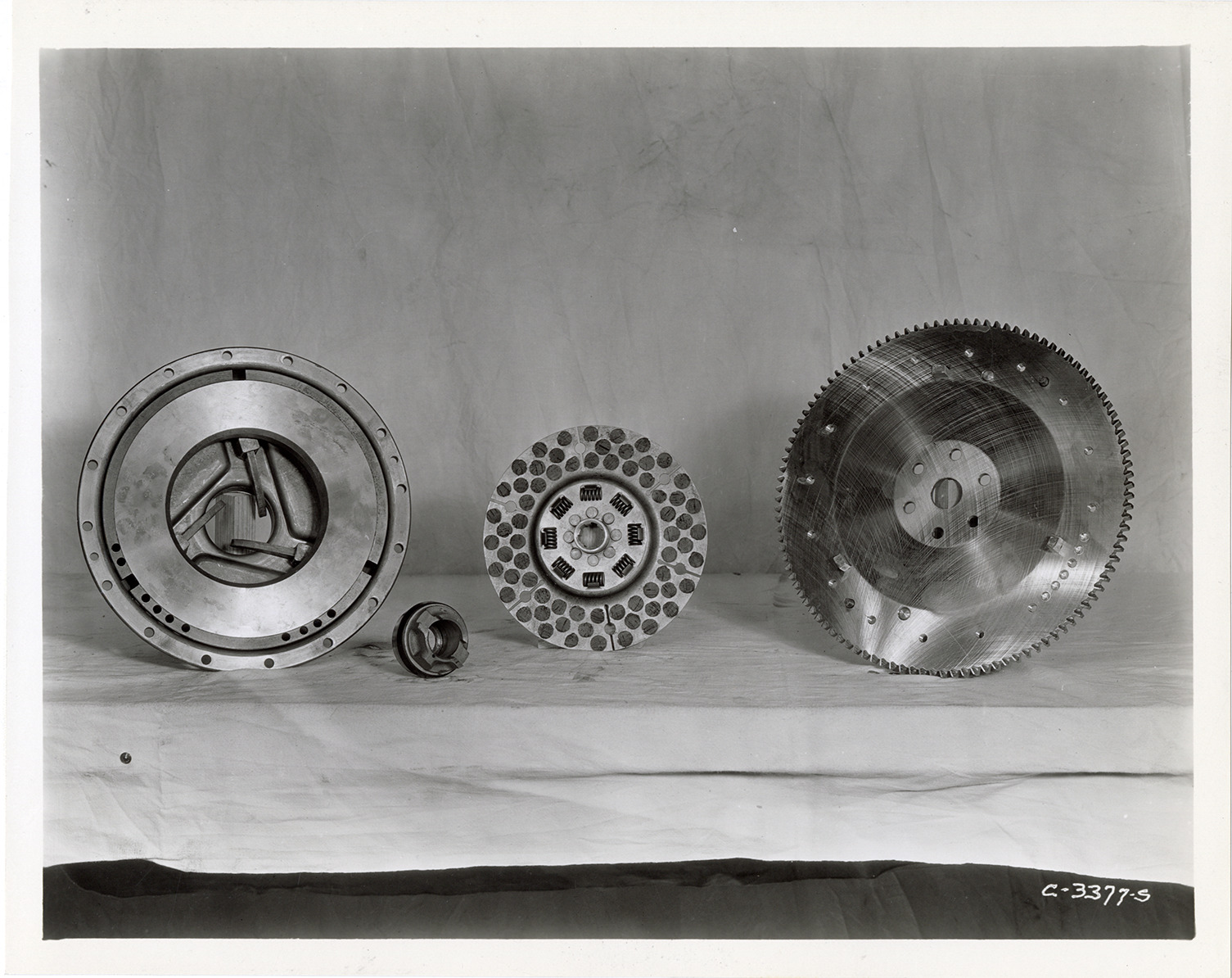 View of the clutch, flywheel, throwout bearing and drive plate for 1933 Essex Terraplane 6 and 8 Series K and KT cars. Handwritten on back: "2-28-33. Model K & KT (Terraplane 6 & 8). Clutch, flywheel, throwout bearing and drive plate."