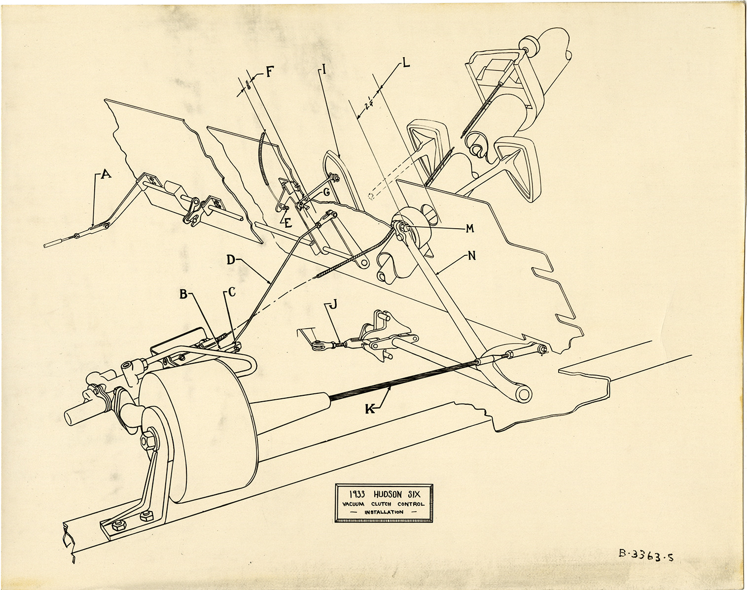 Mechanical drawing of the vacuum clutch control installation for a 1933 Hudson 6 car. Printed on front: "1933 Hudson Six vacuum clutch control installation." Handwritten on back: "Feb. 16/33. Copy negative of line drawing of Hudson Six vacuum clutch control installation, 1933."