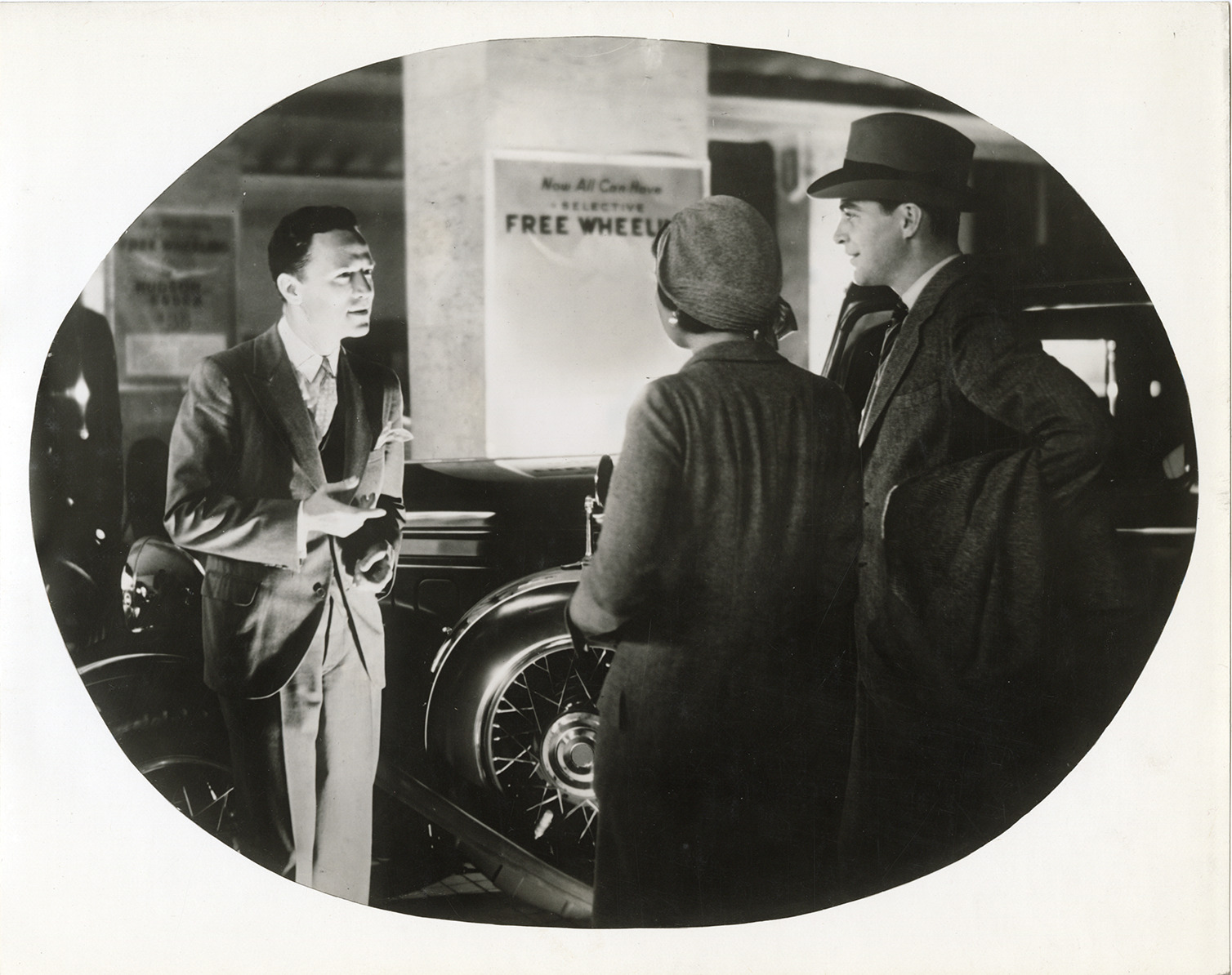 View of an advertisement appearing in the Saturday Evening Post, depicting salesman speaking to a man and woman in Hudson automobile showroom. Handwritten on back: "Nov. 1931. Photo of illustration used in Saturday Evening Post ad and appearing week of Nov. 7, 1931."