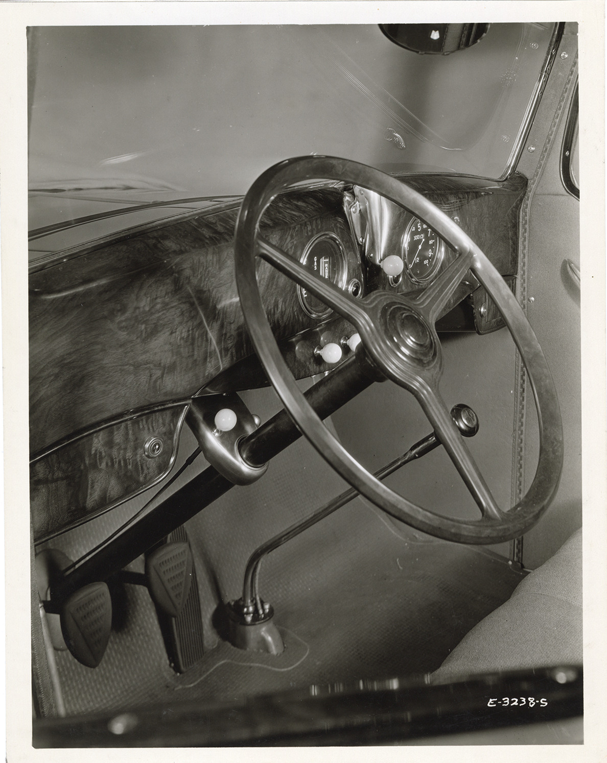 Instrument panel, steering wheel and clutch control knob, 1932 Hudson automobile