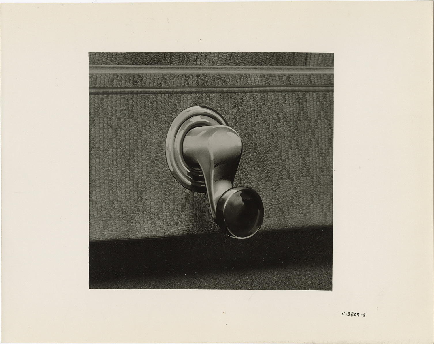Artist's depiction of the seat adjustment handle for 1932 Hudson and Essex Terraplane cars. Handwritten on back: "Nov. 10, 1931. Copy neg. retouched photo. Hudson Essex seat adjustment, all models, front & rear seats."