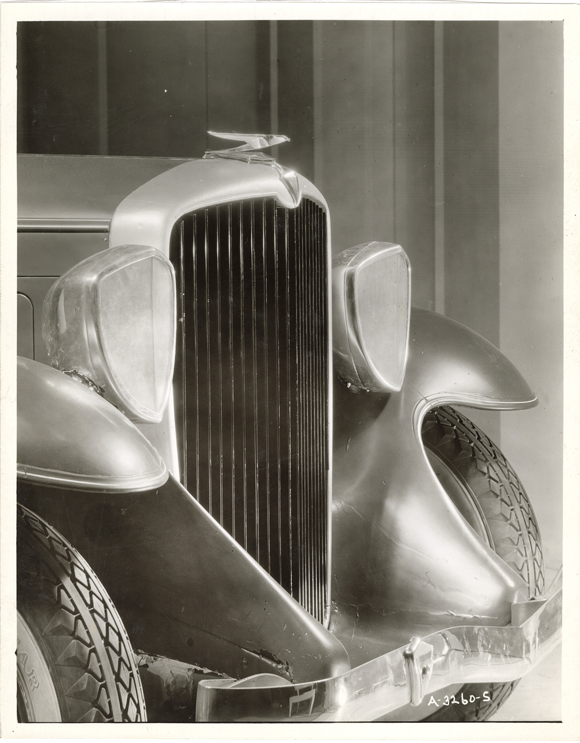 View of the front end of a 1932 Hudson car, showing grille, headlights and radiator ornament. Handwritten on back: "8/26/31. Hudson front end, see also A3256S. Lamp & fender at left of photo, actually 1" high. Right lamp & fender (at right of photo) correct. This corrects previous view #A3201."