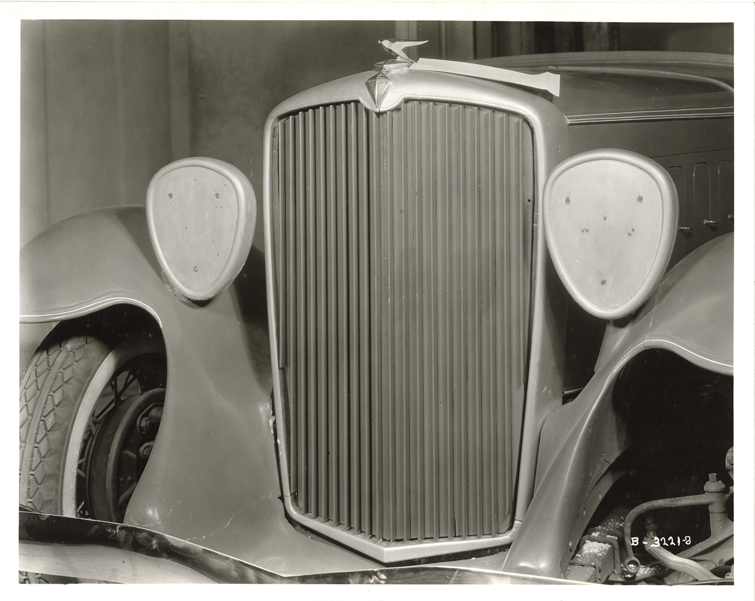 View of the front end of a 1932 Hudson car, showing grille, headlights and radiator ornament. Handwritten on back: "Oct. 12/31. Hudson front. Close up, lamp at right of photo correct. Change left lamp accordingly. See A3297S for grille detail. Do not use chromium strip down center as in A3297S."