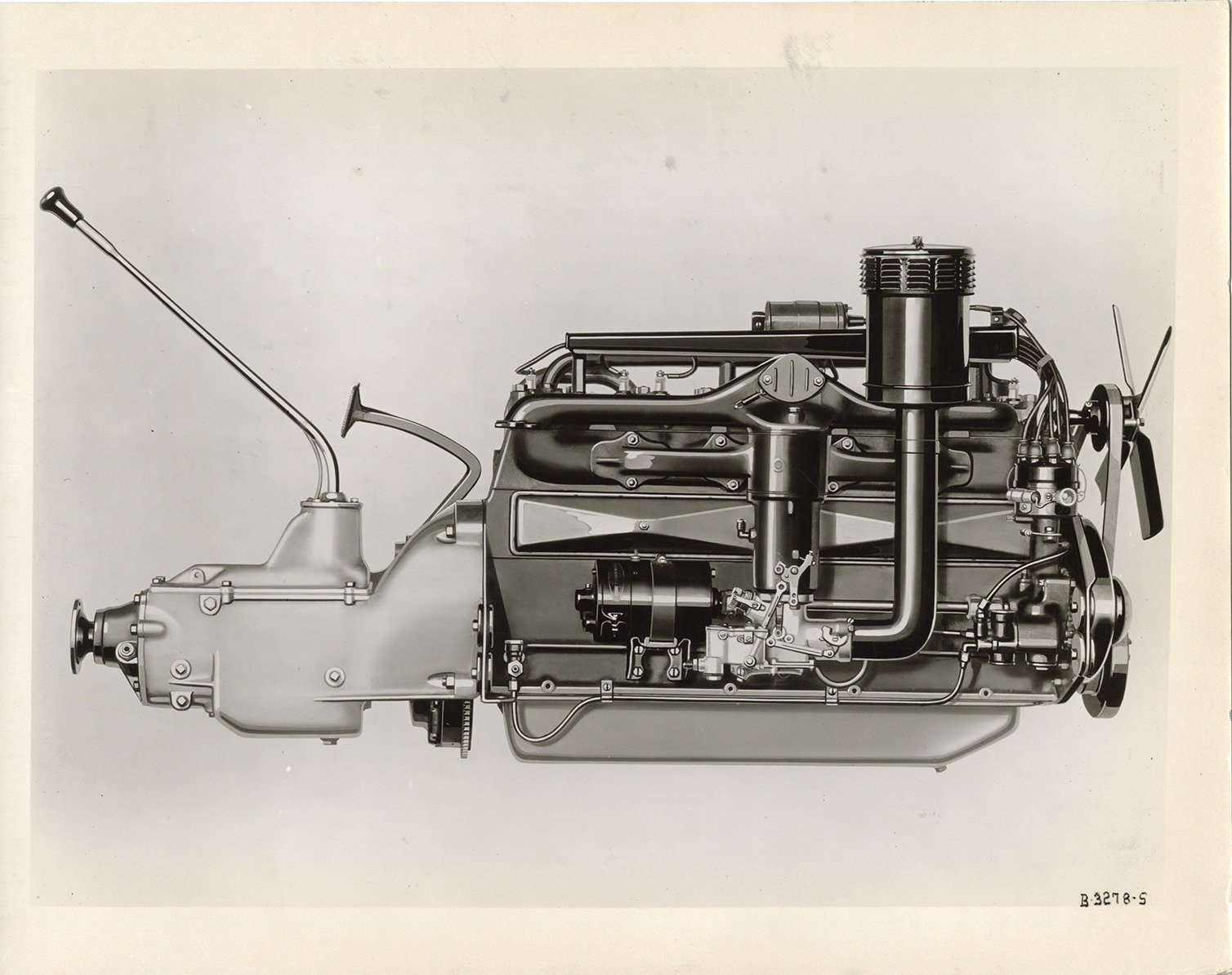 Artist's depiction of the engine and transmission for a 1932 Hudson car. Handwritten on back: "Oct. 24/31. Copy negative of retouched photo of Hudson motor & transmission."