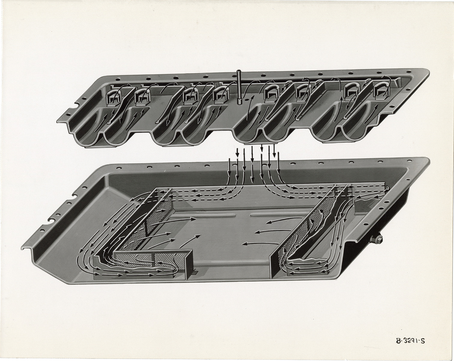 Artist's depiction of an oil pan for a 1932 Hudson car. Handwritten on back: "Nov. 4/31. Copy negative of Hudson oil pan drawing."