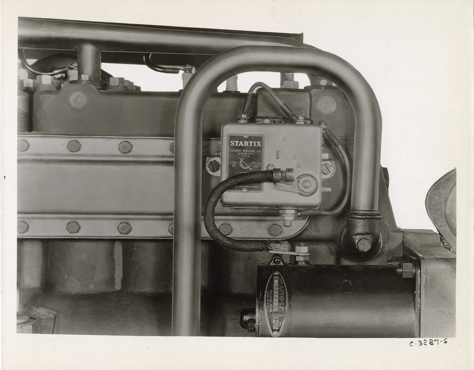 Close-up view of a Startix starter, manufactured by the Eclipse Machine Co., on a 1932 Hudson car. Handwritten on back: "Nov. 20, 1931. Copy neg. retouched photo Hudson Startix installation."
