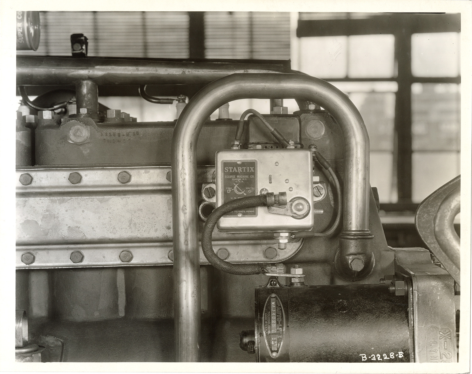 Close-up view of a Startix starter, manufactured by the Eclipse Machine Co., on a 1932 Hudson car. Handwritten on back: "Oct. 12/31. Hudson 1932 Startix installation. Remove black hole at left of box between starter cable & mounting. Retouch same tone as water jacket."
