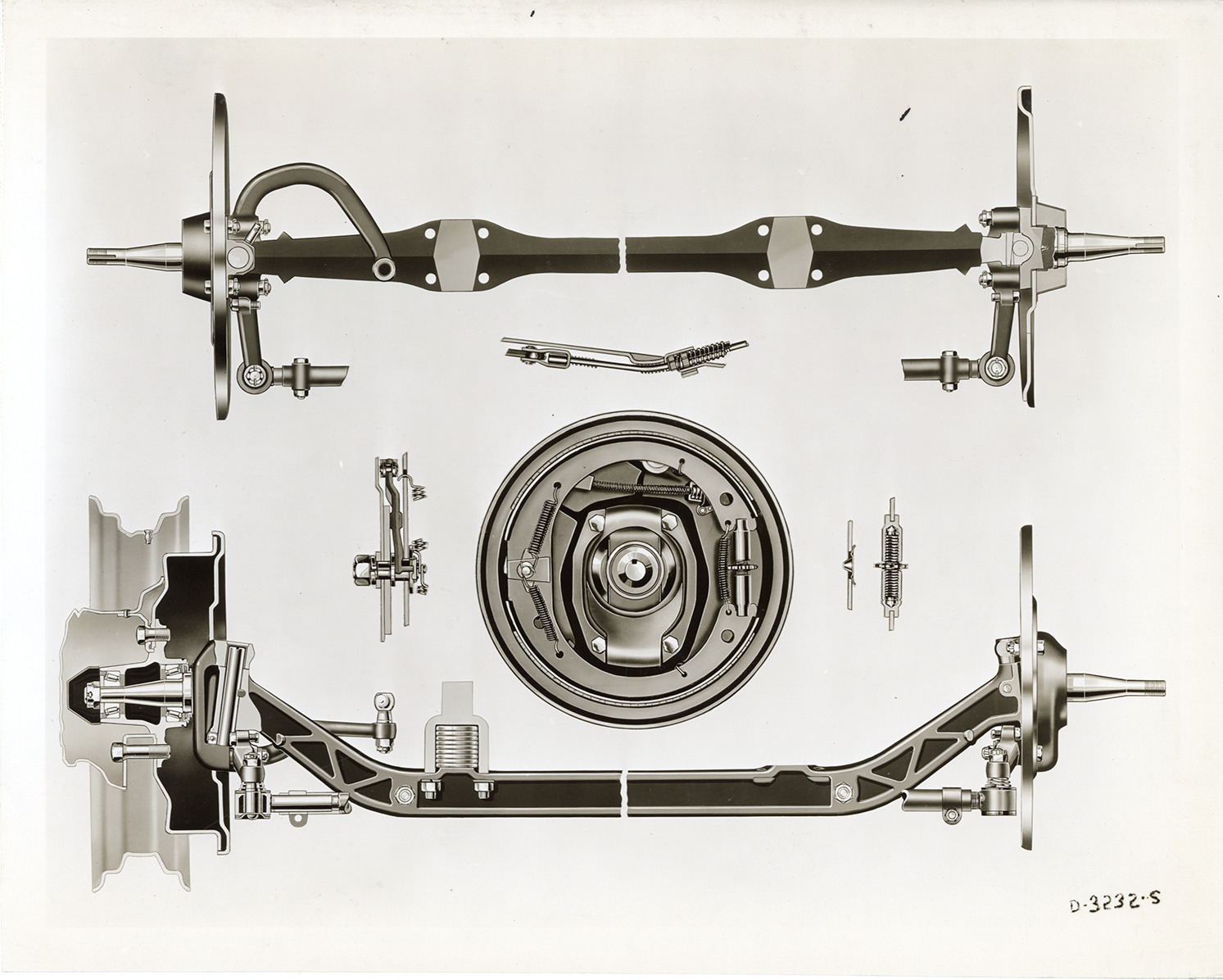 Artist's depiction of the front axle assembly for 1932 Hudson and Essex Terraplane cars. Handwritten on back: "Jan. 7/32. Copy negative of wash drawing of cross sections of 1932 Hudson-Essex front axle."