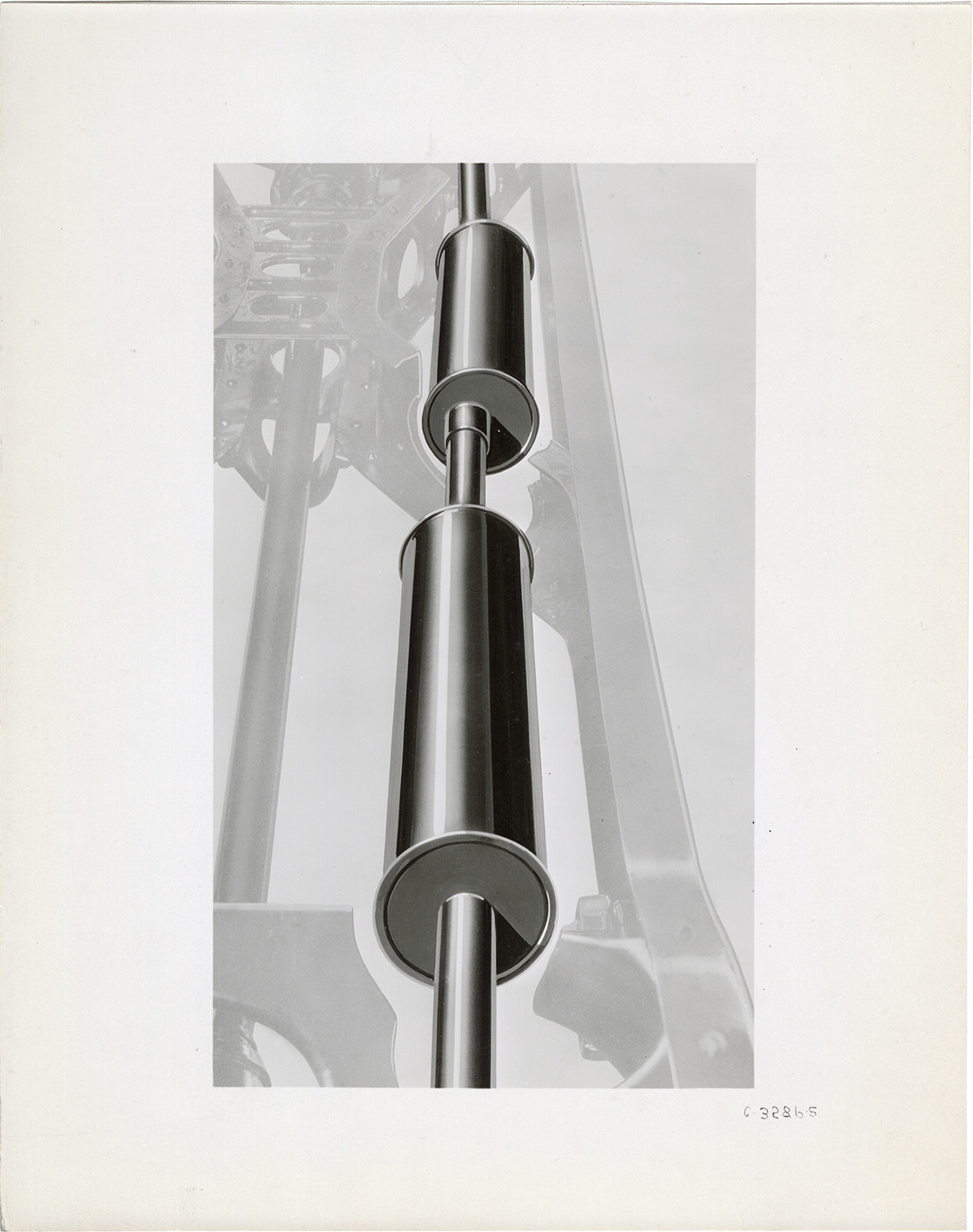 Artist's depiction of the muffler for 1932 Hudson and Essex Terraplane cars. Handwritten on back: "Nov. 20, 1931. Copy neg. retouched photo, Hudson-Essex twin Neutratone muffler in chassis."