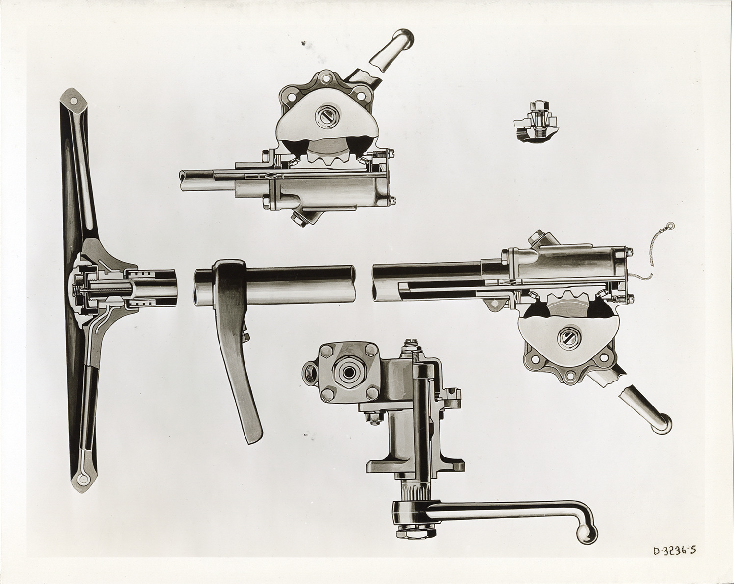 Artist's depiction of cross section of steering gear for 1932 Hudson and Essex Terraplane cars. Handwritten on back: "Jan. 7/32. Copy negative of wash drawing showing cross section of 1932 Hudson Essex steering gear."