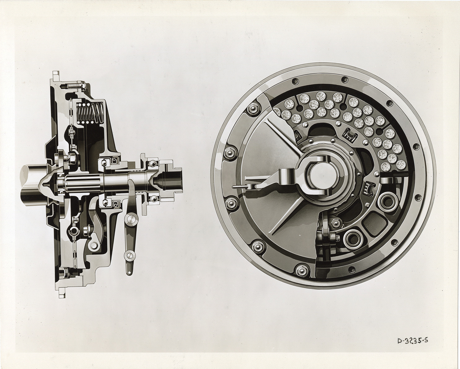 Artist's depiction of clutch components for a 1932 Hudson car. Handwritten on back: "Jan. 7/32. Copy negative of wash drawing of cross section of Hudson clutch. End & side views."