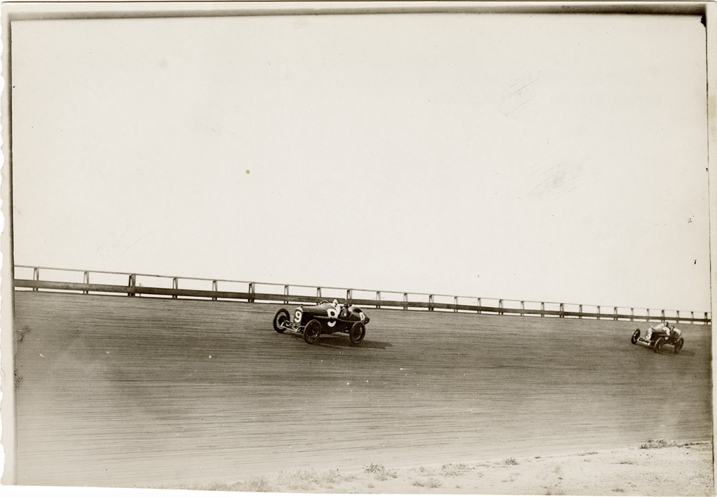 View of Ralph Mulford in Peugeot car no. 9 and Johnny Aitken in Peugeot car no. 3 racing on track during 1916 races at Sheepshead Bay, New York. Handwritten on back: "9, Mulford, Peugeot. 3, Aitken, Peugeot. Sheepshead Bay, 1916. Peugeot, 1916."