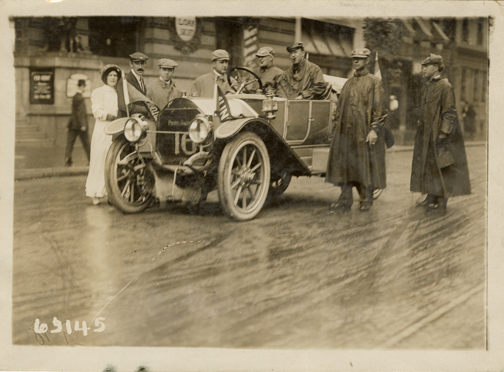 View of motorists posing with Pierce-Racine car no. 16 during the 1910 Munsey Historic Tour. Organized by the Munsey newspapers, the endurance contest covered a route through ten states. Stamped on back: "Spooner & Wells, Inc., photographers, telephones 3472-3473 Columbus, 1931 Broadway, New York." Handwritten on back: "Pierce-Racine, ca. 1910."