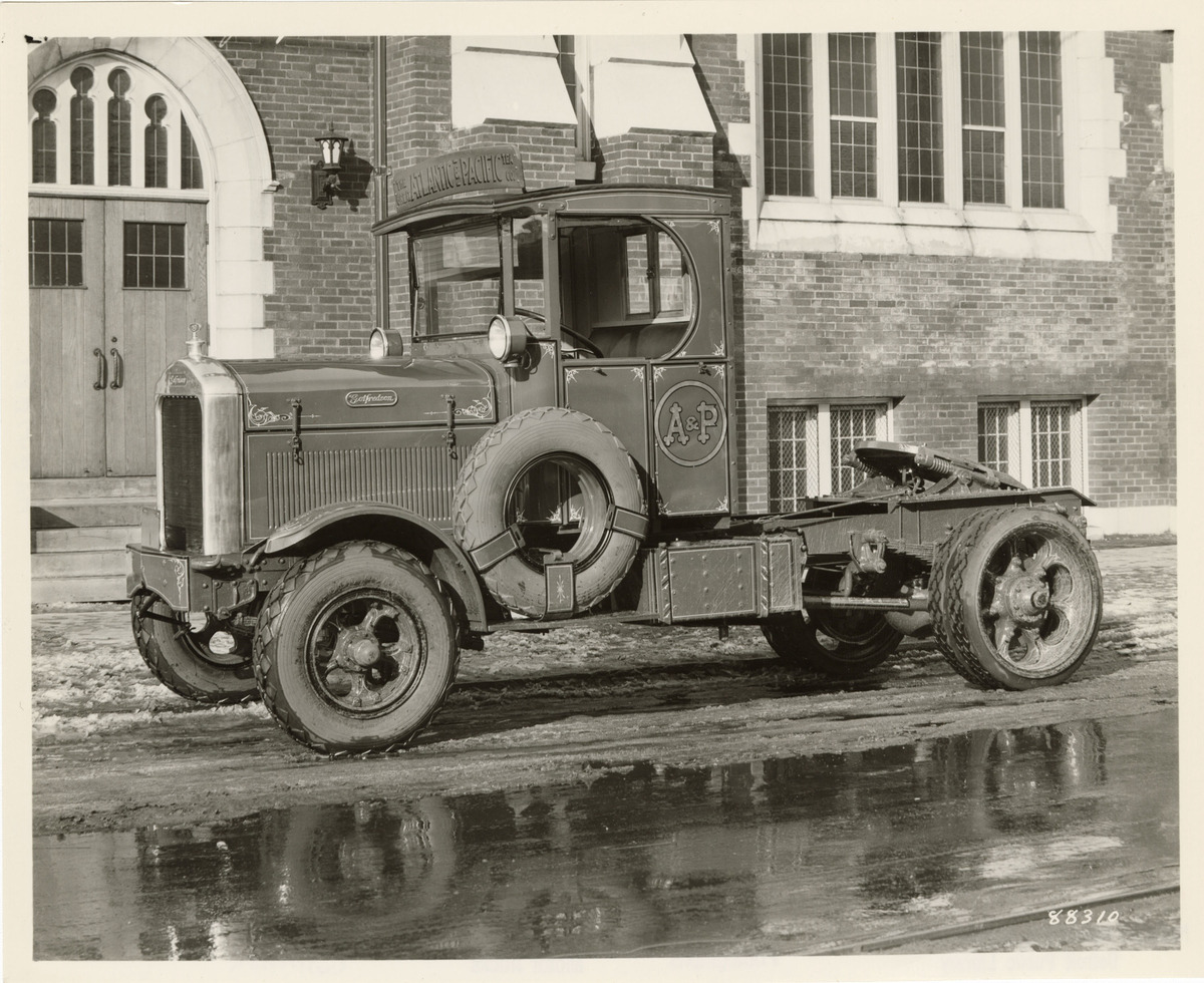 View of a Gotfredson truck, owned by the Great Atlantic and Pacific Tea Company. "A&P" and "The Great Atlantic & Pacific Tea Co." is painted on truck. Stamped on back: "From the Manning Bros. collection. This photo may not be reproduced without the permission of Manning Bros. commercial photographers, 16300 Brush Street, Highland Park 3, Mich." Handwritten on back: "Gotfredson."