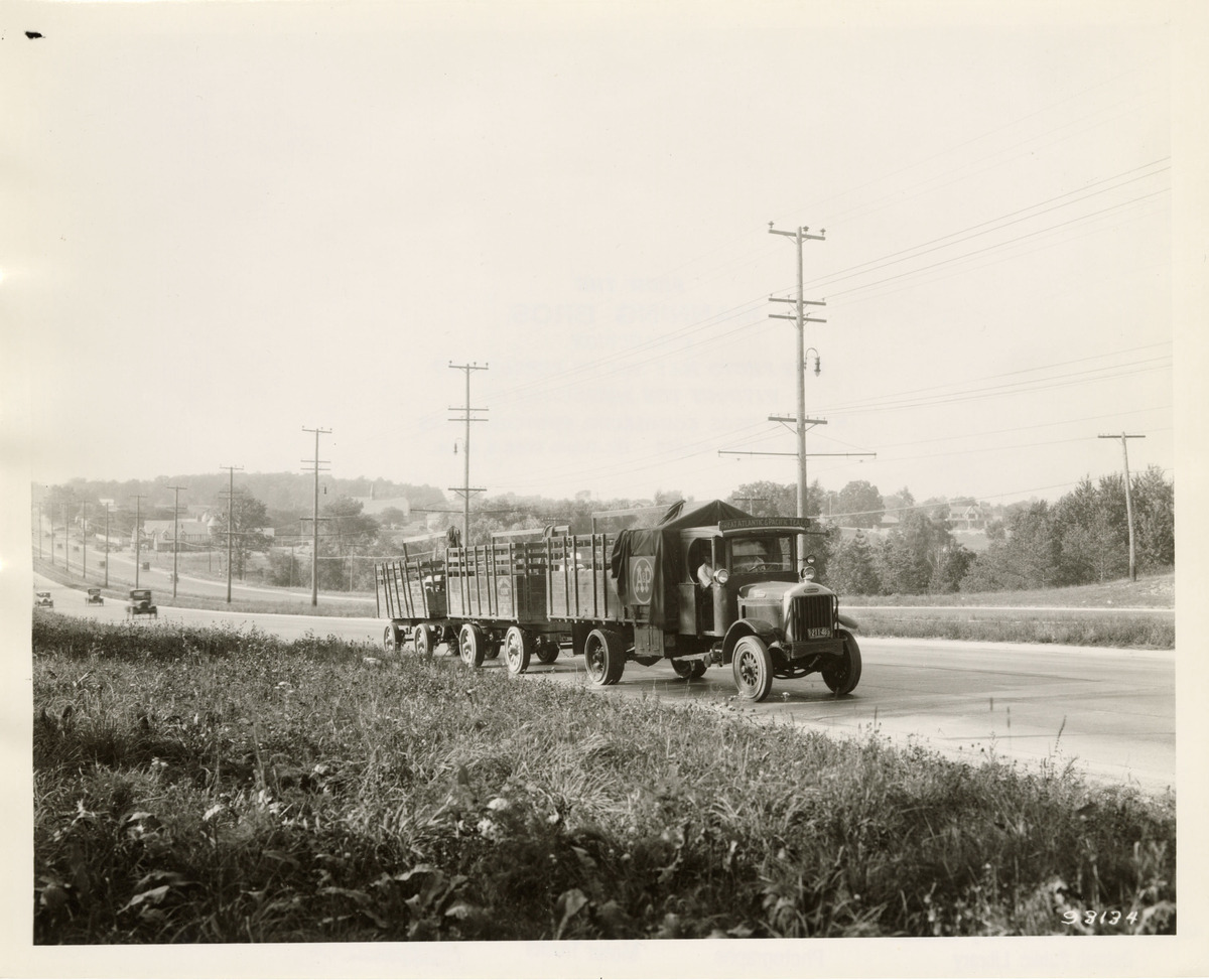 View of a Gotfredson truck and trailers, owned by the Great Atlantic and Pacific Tea Company, traveling on Woodward Ave. "A&P" and "The Great Atlantic & Pacific Tea Co." is painted on truck. Stamped on back: "From the Manning Bros. collection. This photo may not be reproduced without the permission of Manning Bros. commercial photographers, 16300 Brush Street, Highland Park 3, Mich." Handwritten on back: "Gotfredson. Woodward Ave., Bloomfield. Sept. 1928."