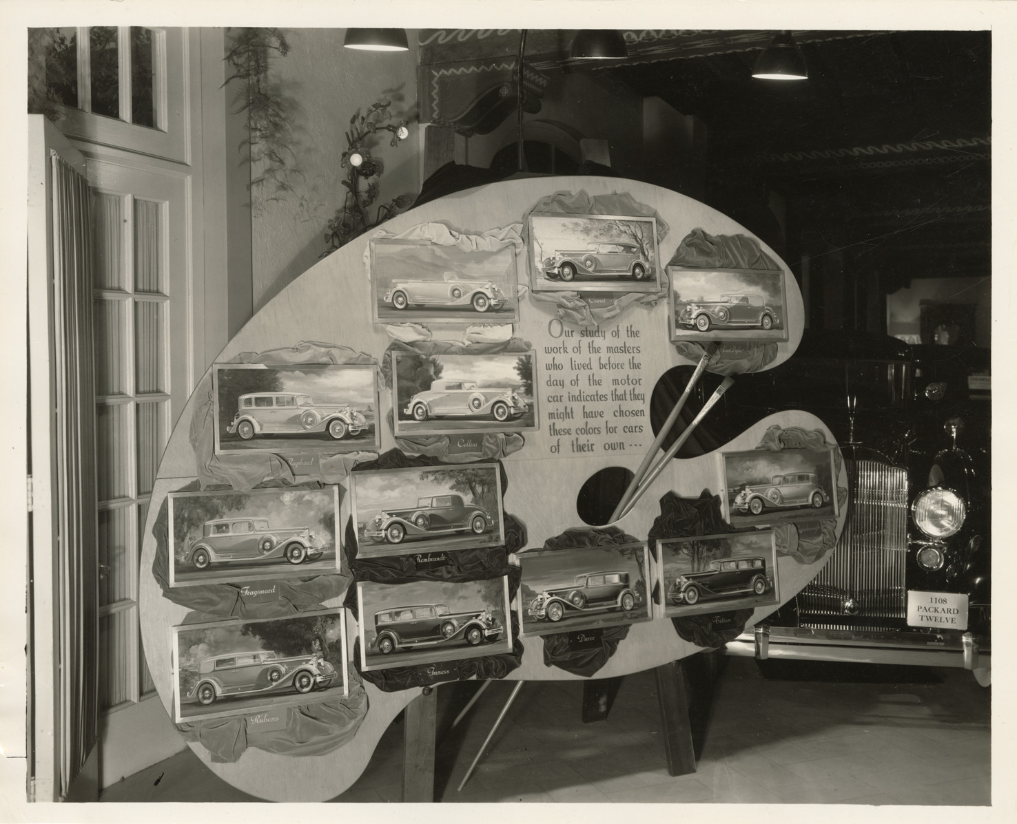 Favorite this☆ Images of 1934 Packard Twelve automobiles displayed on artist's palette Description: View of images of 1934 Packard Twelve, Eleventh Series, Models 1107 and 1108 cars on an artist's palette. Handwritten on back: "Packard, 1934. Wall display illustrating 1934 Packard Twelve line. Eleventh Series, Models 1107 & 1108. 12 cy., 160 b.h.p., 142" & 143" whb. At right: 1934 Packard Twelve, Eleventh Series, Model 1108. 12 cy., 160 b.h.p., 147" whb. Sedan, 7-p. Body-type #734." Details Resource ID: na047036 Subject: Packard automobile Palettes Photographic prints Date Issued: 1934 Format: 1 photographic print ; 8 x 10 in. Member of: National Automotive History Collection Packard Collection Filing Location: Packard, 1934, #8 Negative Number: 7760-A Rights: Physical rights are retained by DPL. Copyright is retained in accordance with U.S. copyright laws.