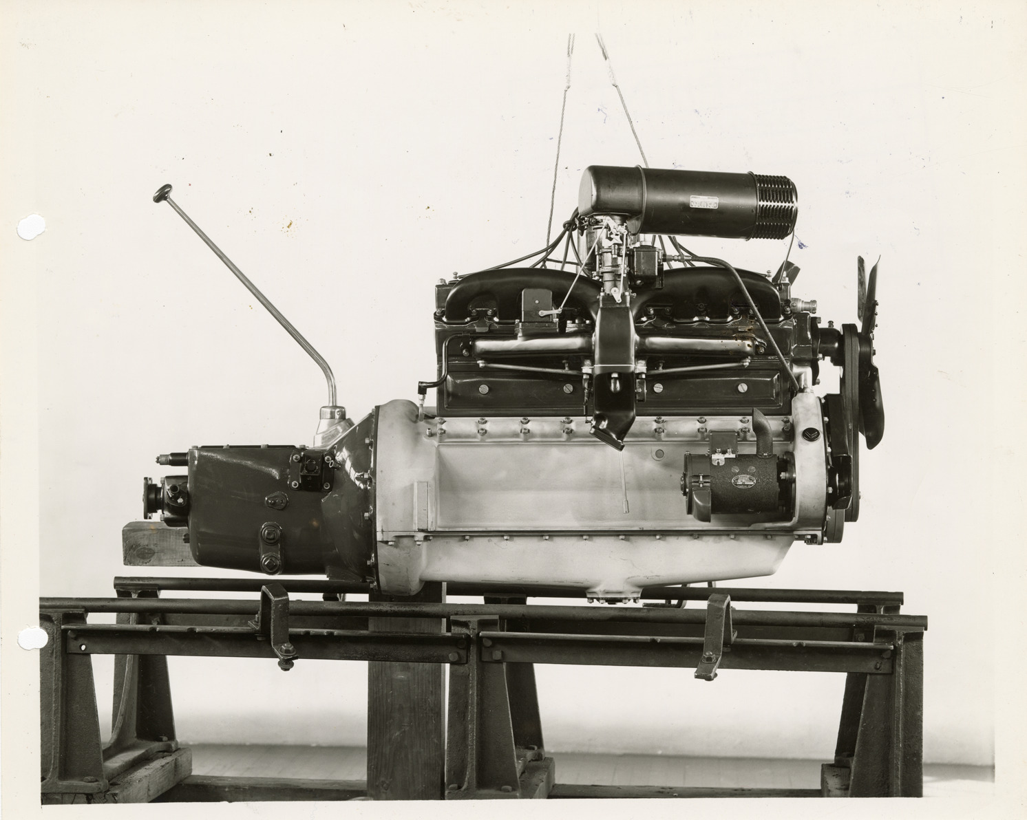 Close-up view of a 1934 Packard Eight, Eleventh Series engine. Handwritten on back: "Packard, 1934. 1934 Packard Eight, Eleventh Series, 8 cy., 120 b.h.p. Engine."