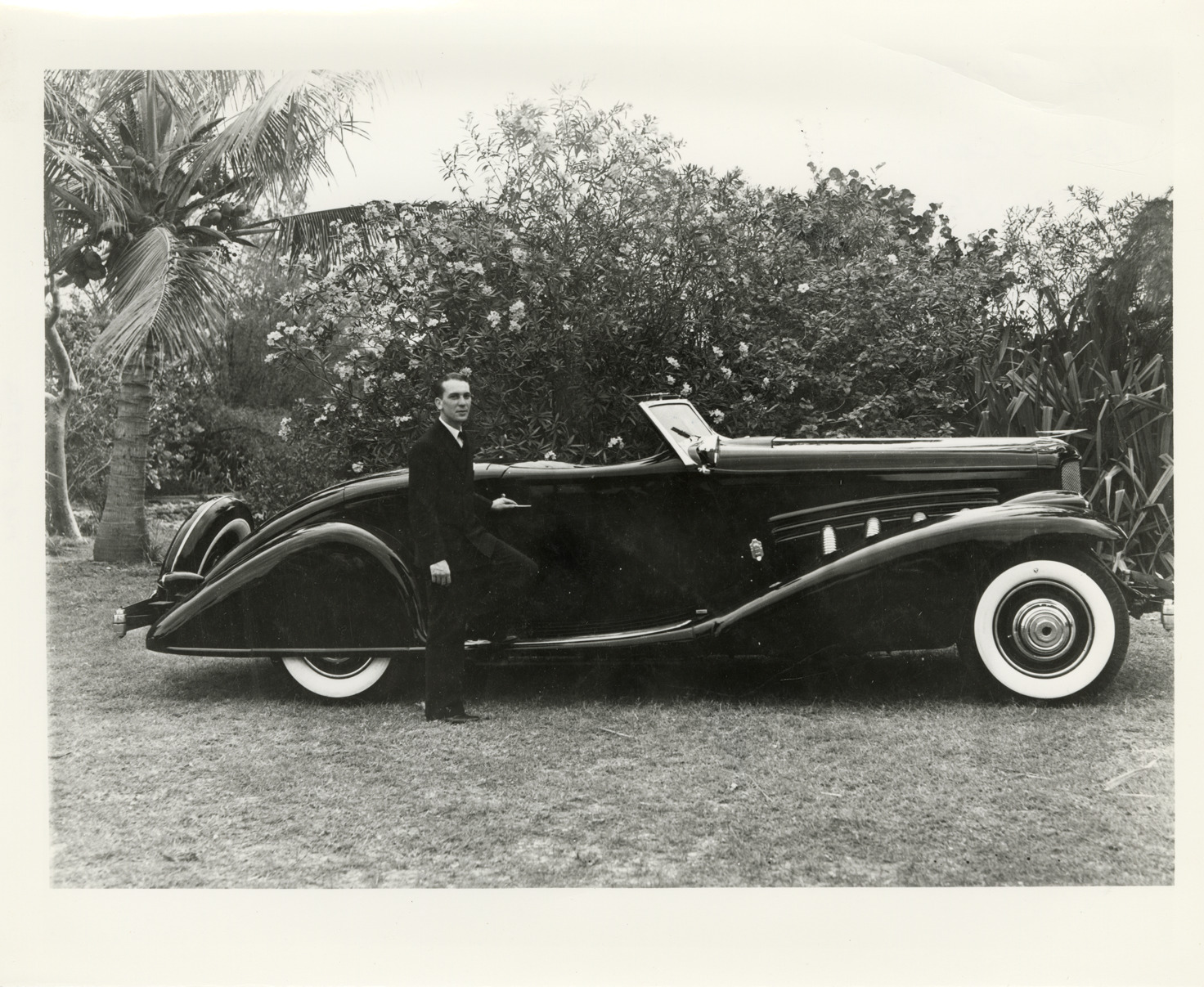 View of a man posing with a Duesenberg J572 convertible coupe. Handwritten on back: "Neg. 4-84. B&S conv. coupe, 2596, J572."