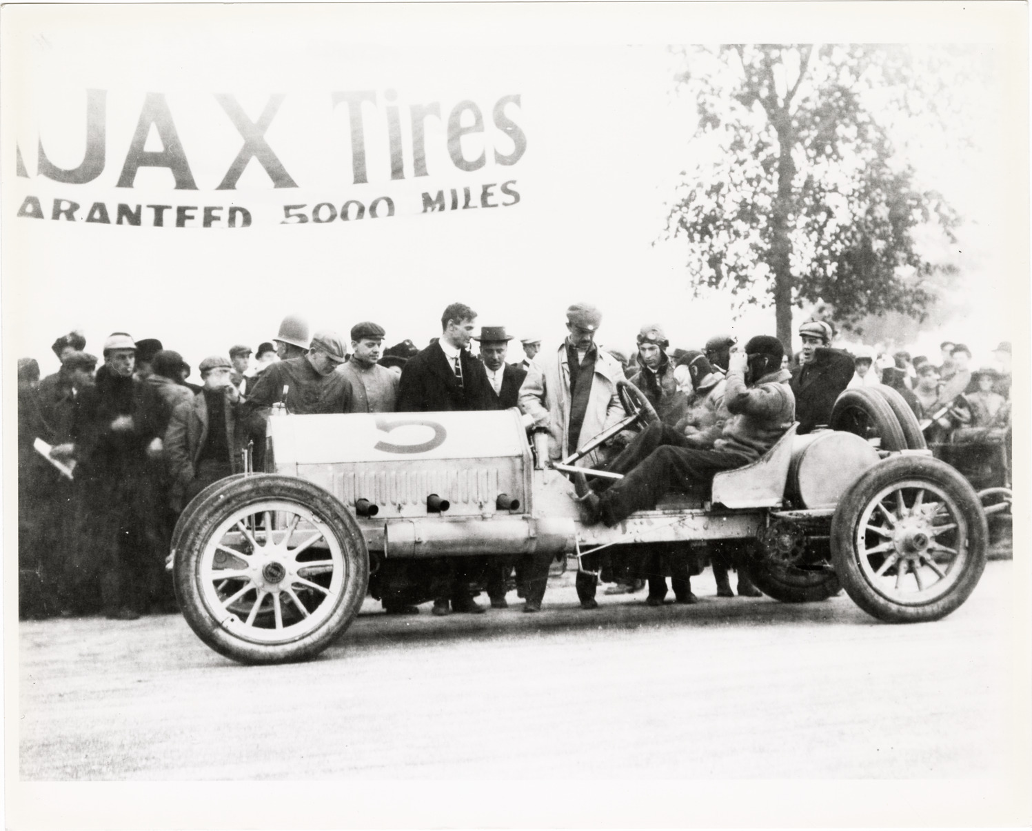 View of a driver and passenger in Alco car no. 5. Onlookers in background. Handwritten on back: "Alco racer, ca. 1909."