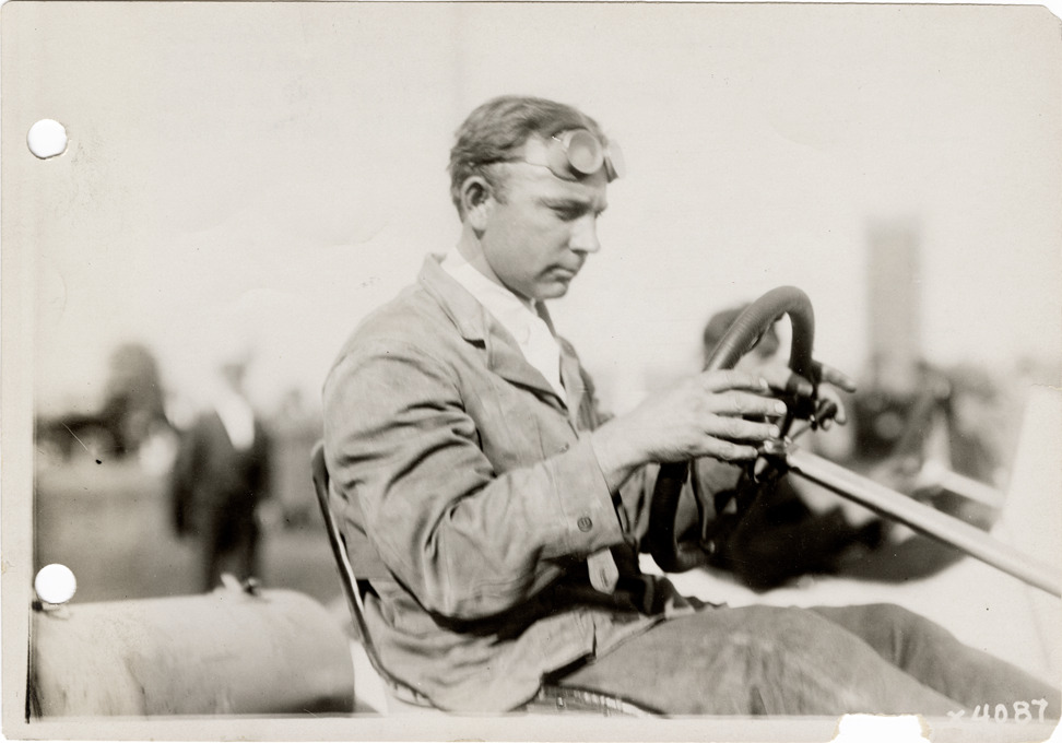 Close-up of Frank Kulick in a Ford racecar during the automobile races at the Michigan State Fairgrounds. Stamped on back: "Spooner & Wells, Inc., photographers, 1231 Woodward Ave., Detroit, Mich., telephone North 1745." Handwritten on back: "Frank Kulick in Ford."