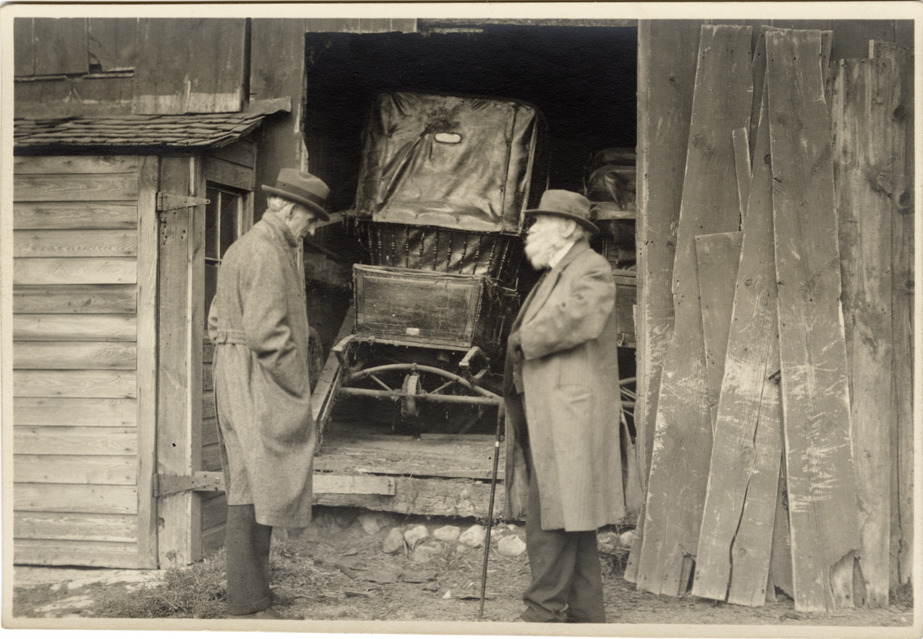 View of Henry Ford and Ralzemond A. Parker looking at Locomobile car stored in barn near Woodward Avenue and 13 Mile Road in Royal Oak, Michigan. Handwritten on back: "Henry Ford, Locomobile. R.A. Parker. Royal Oak, Woodward/13 Mile Rd., 1923."